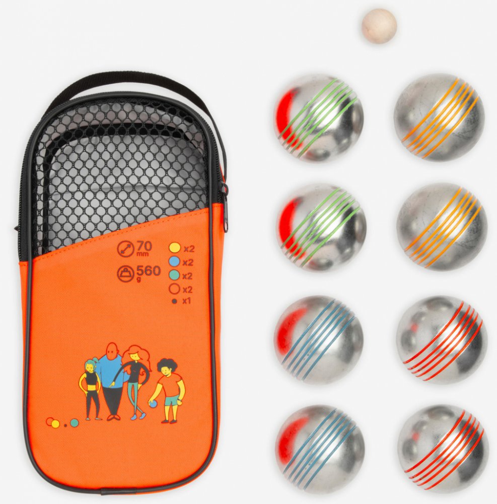 Sada 8 barevných koulí na rekreační hraní hry pétanque s rodinou či přáteli. Tato sada je určená na hraní na měkkém povrchu (písek, tráva...). S touto sadou 8 koulí mohou hrát až 4 hráči! Součástí balení je i košonek. Koule jsou barevně rozlišeny (modrá, žlutá, oranžová, zelená) pro snadné rozpoznání při hře. Jediná velikost a hmotnost 70 mm / 550 g vyhovuje každé dlani. Jedna sada pro celou rodin...