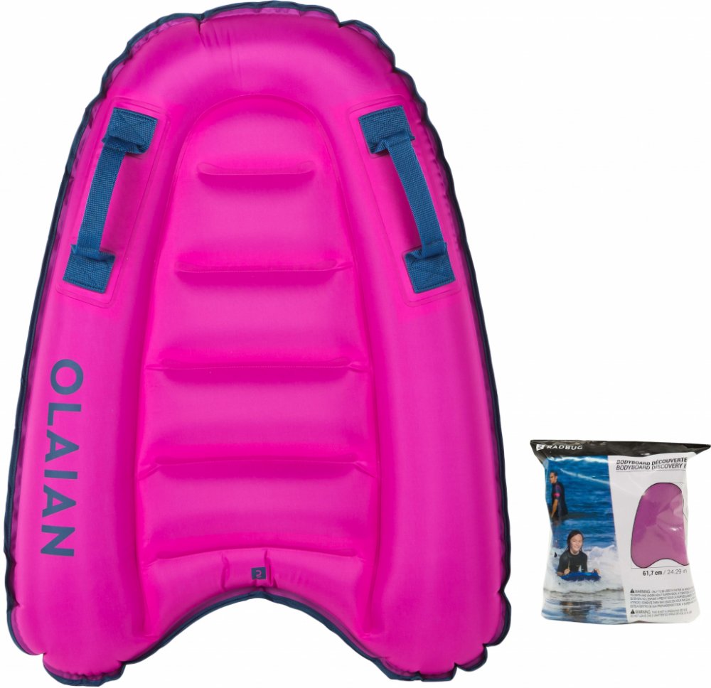 Po nahuštění dobře zasuňte ventilek do bodyboardu, zajistíte tak větší pohodlí.|Tento bodyboard je určený na sjíždění vln v mořské pěně u břehu, kde dítě dosáhne na dno a voda mu sahá max. k pupíku. Při příchodu malé vlny (do 50 cm) se dítě nohama odrazí směrem k pláži a položí se na břicho na bodyboard s rukama na madlech, se skrčenými pažemi a nohama nataženýma dozadu. Není nutné používat ploutve. Struktura látky zajišťuje příjemný kontakt s pokožkou. Tento bodyboard není třeba voskovat.|Upozornění! S ohledem na funkční vlastnosti této hračky hrozí nebezpečí zranění. Malé části - nebezpečí udušení. Používejte pouze v hloubce, kde dítě dosáhne na dno, a pod dohledem dospělé osoby. Zvláště je třeba být opatrný v případě větru a proudů. Doporučujeme používání bezpečnostních pomůcek, jako jsou například plovací vesty nebo rukávky. Není vhodný pro děti mladší 3 let. Můžete připevnit leash, který lze dokoupit zvlášť.|Tento model nafukovacího bodyboardu je vyrobený z jiného materiálu než předchozí modely. To nám umožnilo snížit dopad na životní prostředí o 38 % (38% snížení dopadu na životní prostředí ekvivalentní v kg emisí CO2). Navíc díky novému materiálu a nové konstrukci (spojování spojů) byla zajištěna ještě vyšší odolnost výrobku.|K zachování dobrého stavu bodyboardu vám doporučujeme: