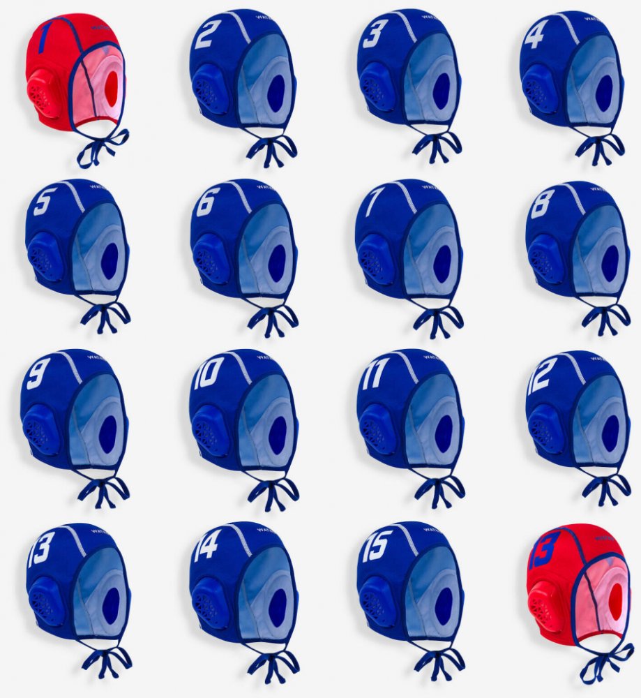 Sada 16 čepic na vodní pólo nebo podvodní hokej. Pohodlné čepice jsou nezbytné pro bezpečné tréninky vodního póla nebo podvodního hokeje. Čepice používají francouzské týmy vodního póla! Materiál neobsahuje elastan, čepice proto pevně drží za všech okolností.|Chrániče uší jsou všity přímo do čepice a kryje je silná vrstva pohodlné textilie, která je příjemná na dotek.|Obsahuje: