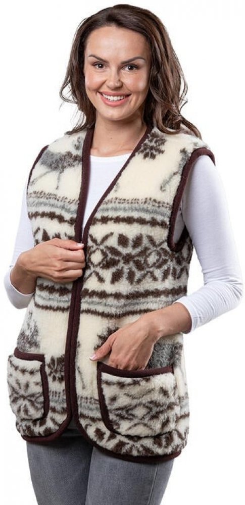 Hřejivá vesta z pravého ovčího rouna je úžasným pomocníkem v mrazivém období – zaručeně ochrání vaše záda před prochladnutím a zároveň je velice slušivá. Vesta má 2 praktické kapsy, zapínání na zip. Decentní potisk inspirovaný norskými vzory. Doporučené praní v pračce, program vlna do 30 °C za pomoci přípravku s lanolinem.