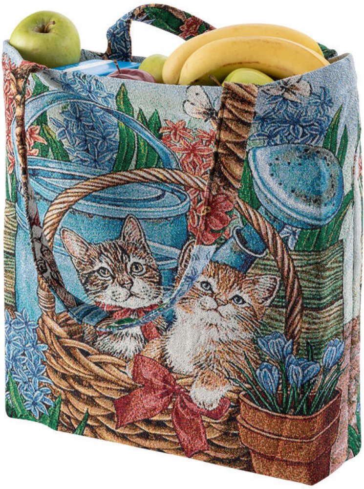 Pevná taška s krásným vytkávaným motivem zahradního zátiší s koťaty vám vydrží roky. Prostorná, lehce ji složíte do kabelky. Materiál: 65 % polyester, 35 % bavlna Rozměry: v. 42 x š. 45 cm Doporučené praní: 30 °C