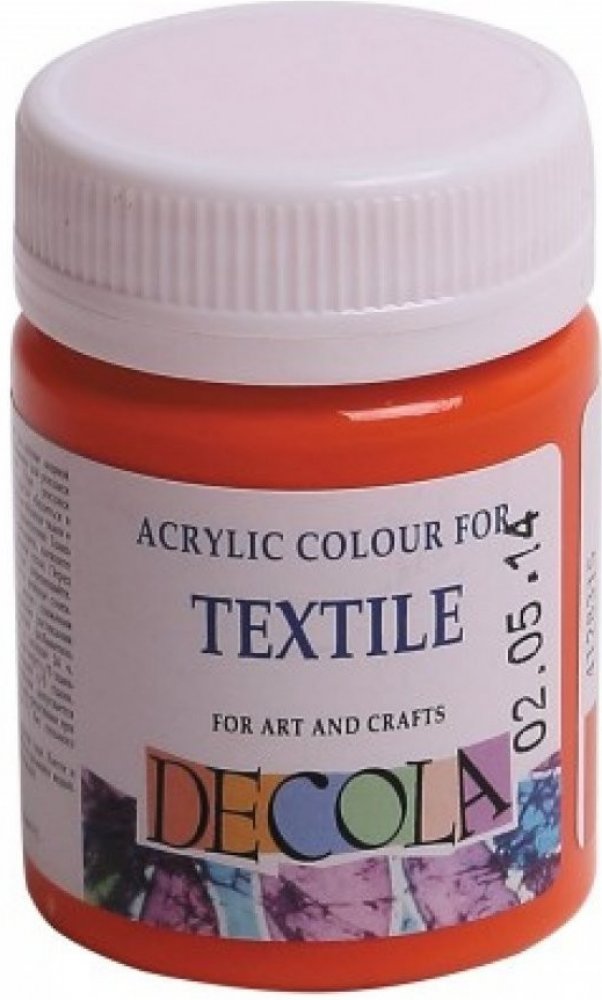 Barva na všechny druhy tkanin, kromě hedvábí. Odstín Oranžová, Decola, obsah 50 ml. Barva je krycí a hustá, vhodná pro razítkování, šablony i malbu. Barvy jsou vzájemně mísitelné. Jsou na vodní bázi. Děti do tří let pouze pod dohledem dospělých osob.