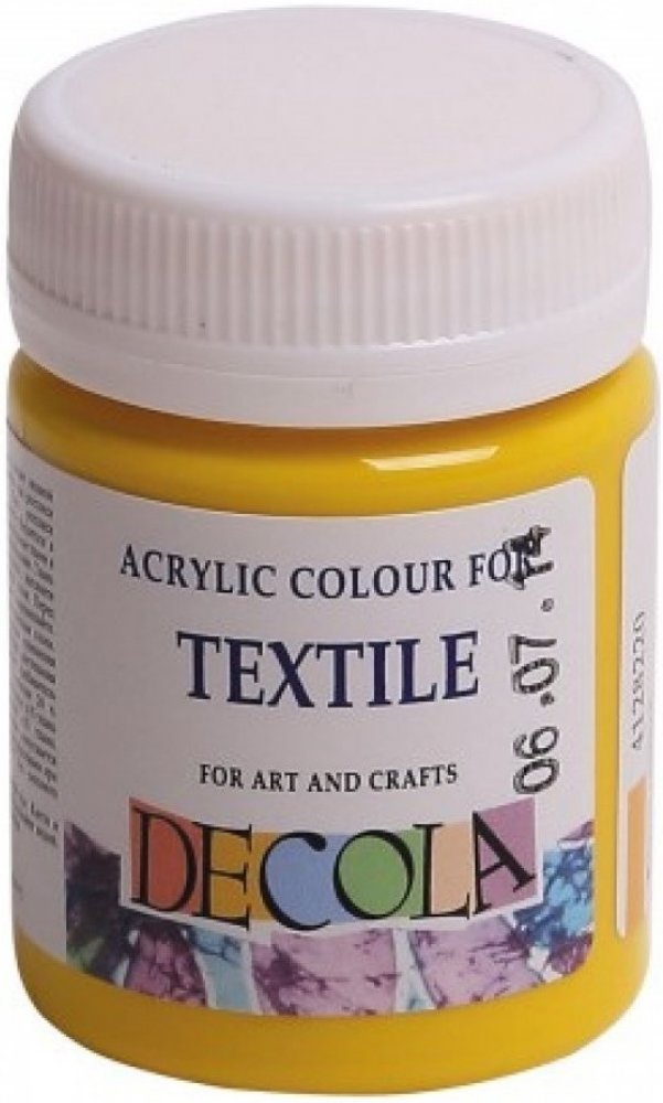 Barva na textil v odstínu žlutá střední Decola 50 ml. Barva je krycí a hustá, vhodná pro razítkování, šablony i malbu. Barvy jsou vzájemně mísitelné. Jsou na vodní bázi. Děti do tří let pouze pod dohledem dospělých osob.