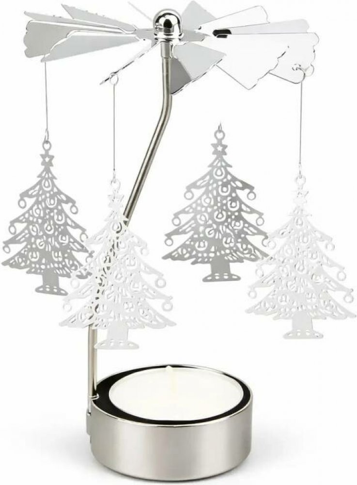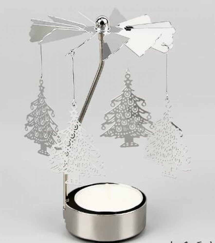 Stříbrné andělské zvonění s motivem vánočních stromečků, velikost 8 × 13 cm. Po zapálení svíčky se roztočí, zacinká a vykouzlí jemné zimní světelné odlesky. Elegantní dekorace i malý vánoční dárek.