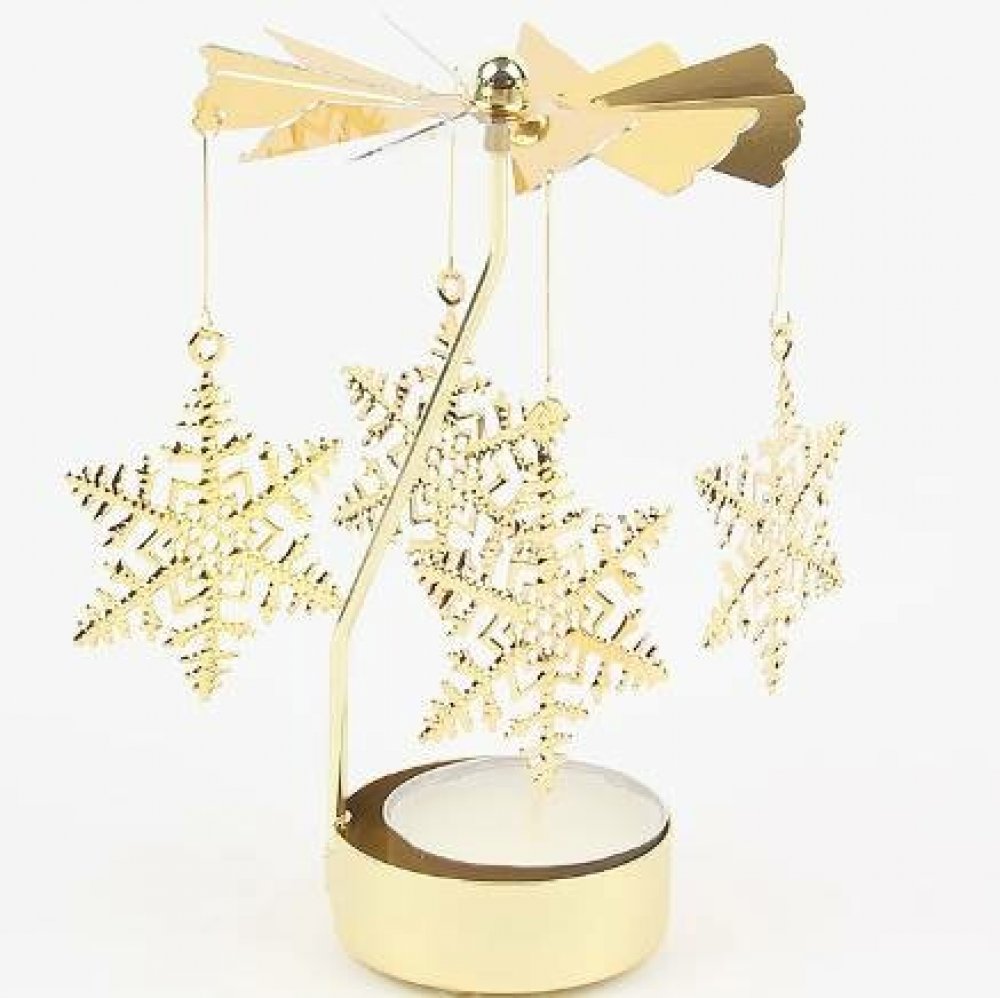 Zlaté andělské zvonění s motivem vloček, velikost 8 × 13 cm. Po zapálení svíčky se roztočí a vytvoří krásné třpytivé světelné odlesky. Elegantní zimní dekorace i skvělý malý dárek.