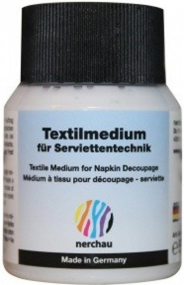 Lepidlo na textil NerchauDekupáž lepidlo ideální na lepení ubrousků na textilní látku. Po zaschnutí je nutná fixace zažehlením z rubové strany, praní - z rubové strany při teplotě 40 ° C, ředitelné vodou, po uschnutí zůstane průhledné.