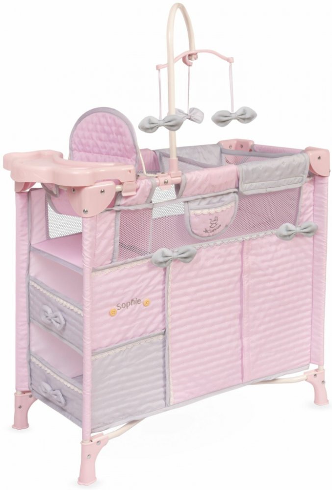 Doplňky a vybavení:• Kolotoč s mašličkami (výška 34 cm)• Přebalovací pultík (17 x 27 cm)• Jídelní židlička a plastový set s lahví, miskou a příborem• Lůžková část (42 x 28 cm) se síťovaným okénkem• Velká šatna na zip s tyčí a 3 ramínky na oblečení pro panenky (40 x 27 x 30 cm)• Dvě úložné poličky• Rozměry postýlky: 70 x 32 x 60 cm (d x š x v)• Panenka, oblečení a předměty na poličkách nejsou součástí balení