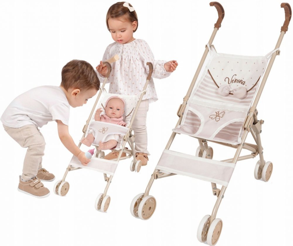 DeCuevas 90078 Skládací kočárek pro panenky golfové hole Verona 2024 - 56 cm patří do stejnojmenné kolekce, která je novinkou roku 2024 a nabízí nejen zmíněné kočárky, ale i jiné doplňky pro malé slečny a jejich panenky. Tato decentní kolekce je celá nesena v jemných pastelových přírodních barvách i vzorech. Kombinace světle béžové a bílé s roztomilými puntíky nebo proužky doplňuje světle hnědé úz...