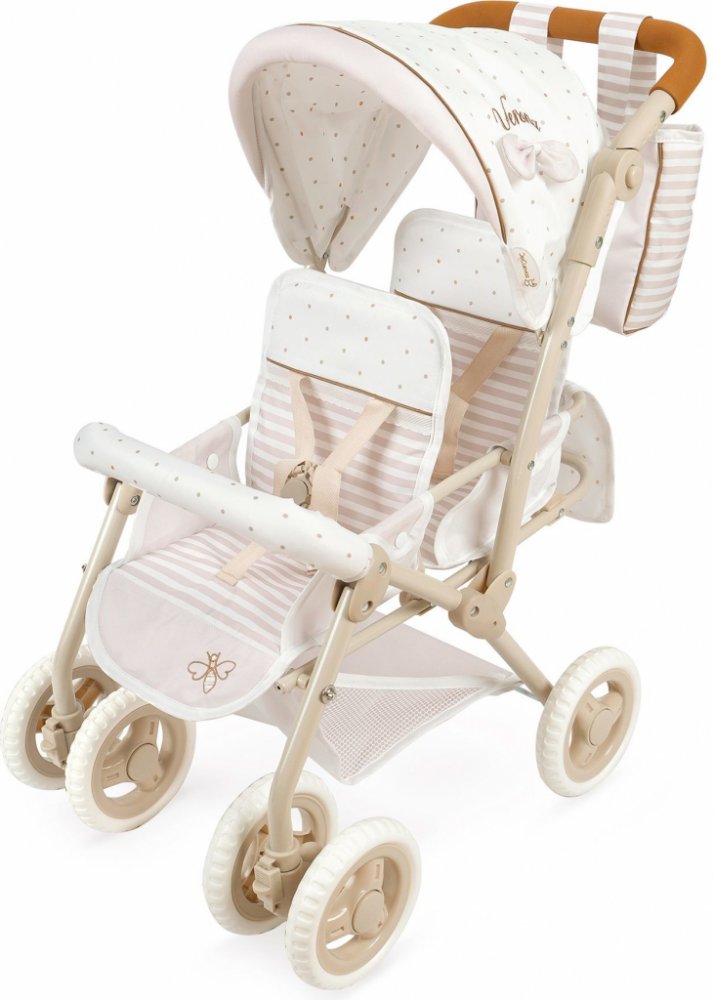 DeCuevas 90378 Skládací kočárek pro dvojčata panenky s taškou Verona 2024 - 72 cm patří do stejnojmenné kolekce, která je novinkou roku 2024 a nabízí nejen zmíněné kočárky, ale i jiné doplňky pro malé slečny a jejich panenky. Tato decentní kolekce je celá nesena v jemných pastelových přírodních barvách i vzorech. Kombinace světle béžové a bílé s roztomilými puntíky nebo proužky doplňuje světle hně...
