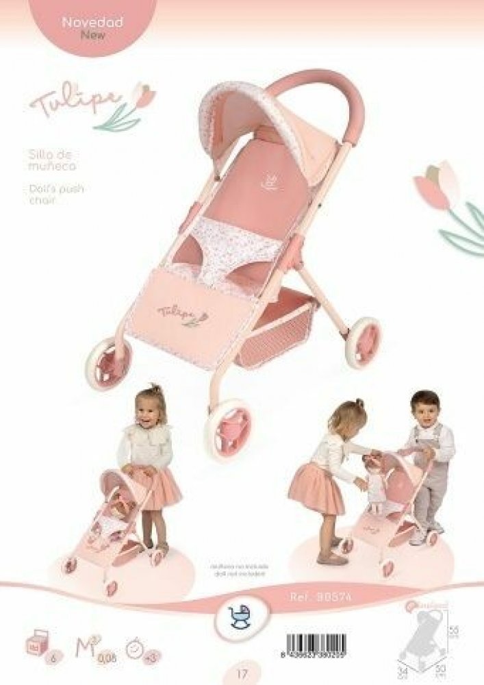 DeCuevas 90574 Sportovní kočárek pro panenky Tulipe 2025 - 55 cm ze stejnojmenné kolekce, která je novinkou roku 2025, je díky nízké rukojeti a váze spíše vhodný pro malé a menší slečny. Tulipe je, jak už sám název napovídá, kolekce plná tulipánů v překrásně sladěných teplých pastelových lososových barvách. Světlejší a tmavší odstíny barev jsou vkusně doplněny drobným květinovým vzorem ve stejných tónech na bílém smetanovém podkladu. Tento motiv ještě navíc u kočárků umocňují svým tematickým tvarem i překrásné, jako tulipán vypadající tašky. Květy tulipánu zdobí i dřevěné výrobky této kolekce. Tato kolekce nabízí výběr výrobků od jídelních sad přes postýlky a kočárky až po dřevěný nábytek pro panenky. Nádherný španělský design, precizní zpracování. Velmi jednoduchá manipulace během samotné hry. Materiál: kov, plast, textil. Balené v krabici ve barvách kolekce. Doporučený věk od 3 let.