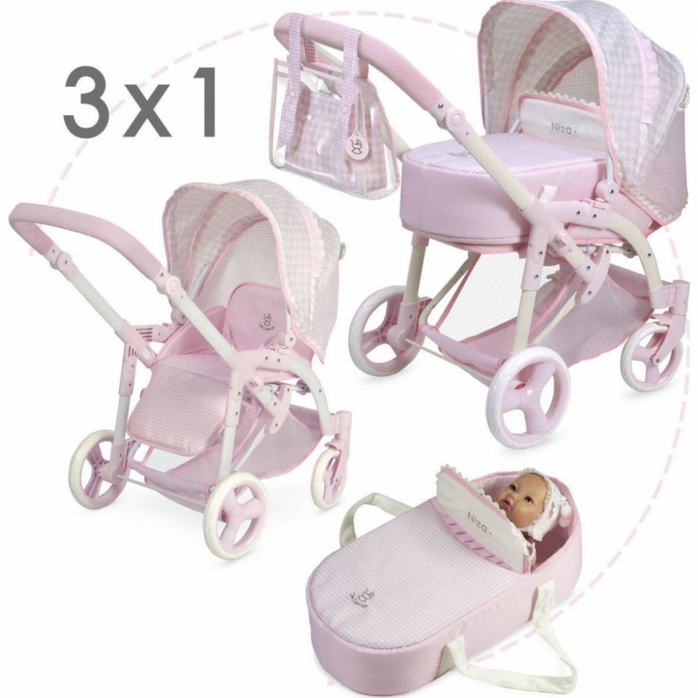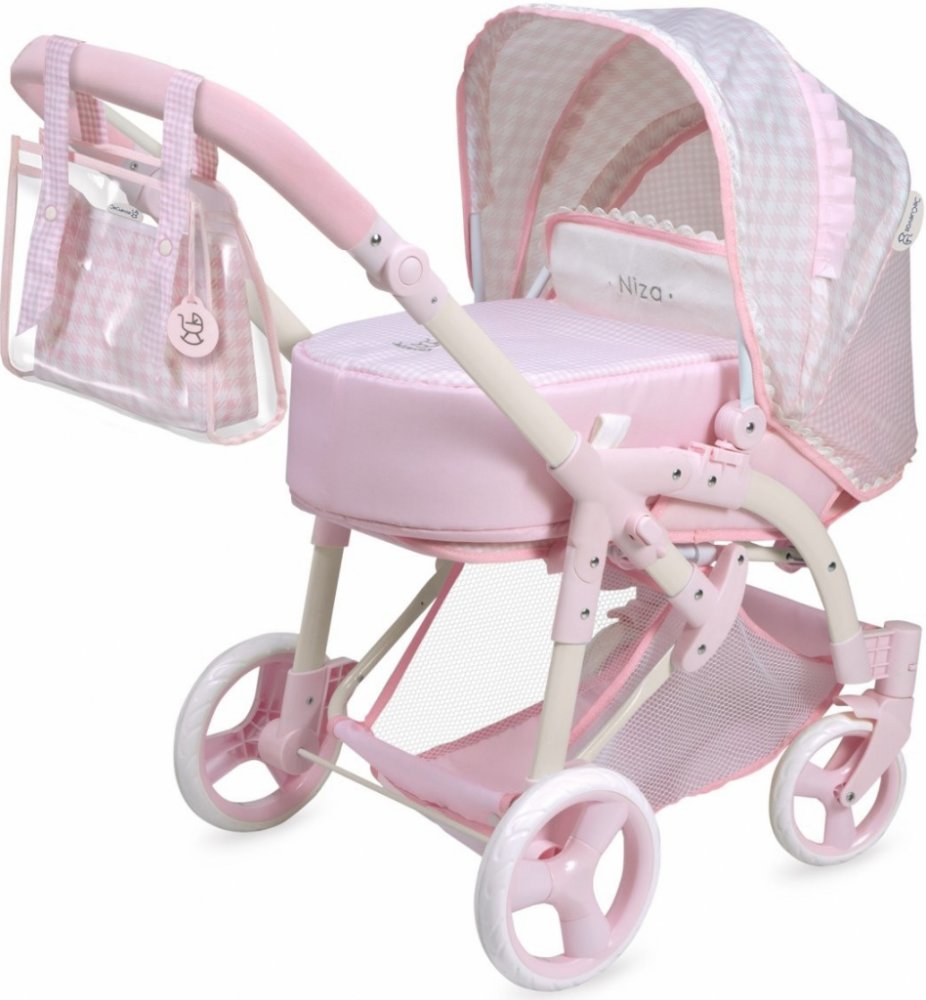 DeCuevas 81646 Skládací kočárek pro panenky 3 v 1 s přenosnou taškou NIZA 2022 - 75 cm patří do stejnojmenné něžně růžové kolekce NIZA která je novinkou roku 2022 a nabízí krom různých druhů kočárků i nábytek pro panenky a malé parádnice. Kolekce je vytvořena z jednobarevného růžového materiálu v kombinaci s růžovobílou drobnější kostičkou, zdobená růžovými lemy a bílými a růžovými drobnými i větš...