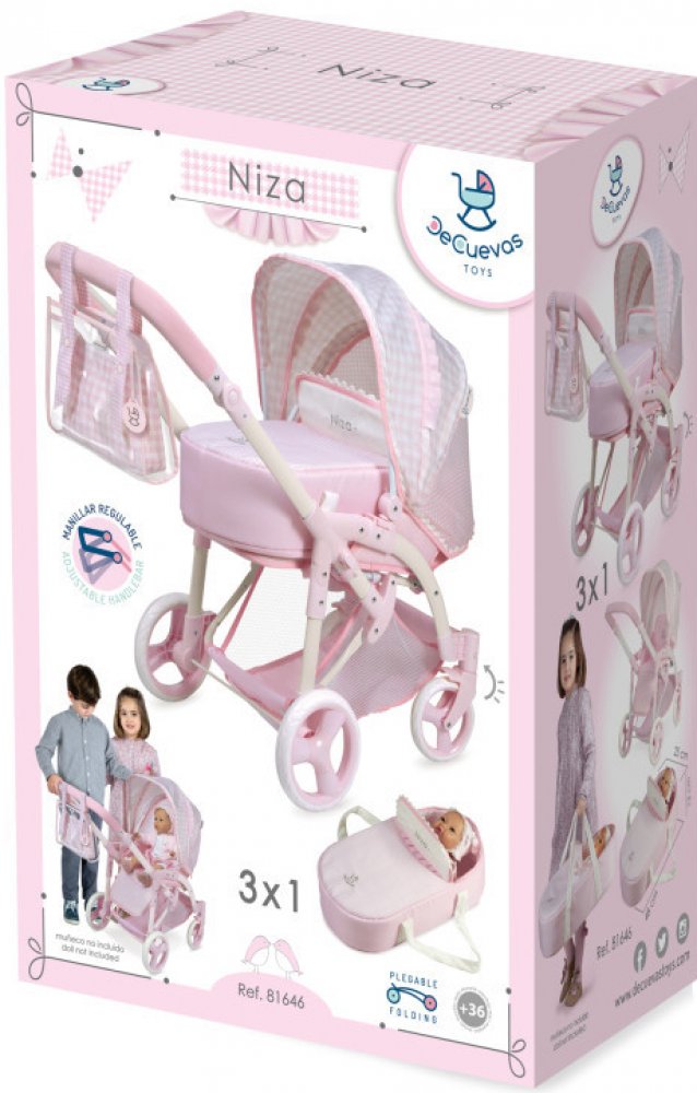 DeCuevas 81646 Skládací kočárek pro panenky 3 v 1 s přenosnou taškou NIZA 2022 - 75 cm, ze stejnojmenné něžně růžové kolekce NIZA, která je novinkou roku 2022, je díky polohovatelné vyšší rukojeti a funkčním doplňkům vhodný spíš pro slečny předškolního věku, které toto vše už více při hraní využijí. Kolekce NIZA nabízí krom různých druhů kočárků i nábytek pro panenky a malé parádnice. Nádherný španělský design, precizní zpracování. Skládací model, velmi snadná manipulace během samotné hry. Materiál: kov, plast, textil. Baleno v krabici v barvách kolekce. Doporučený věk od 3 let.