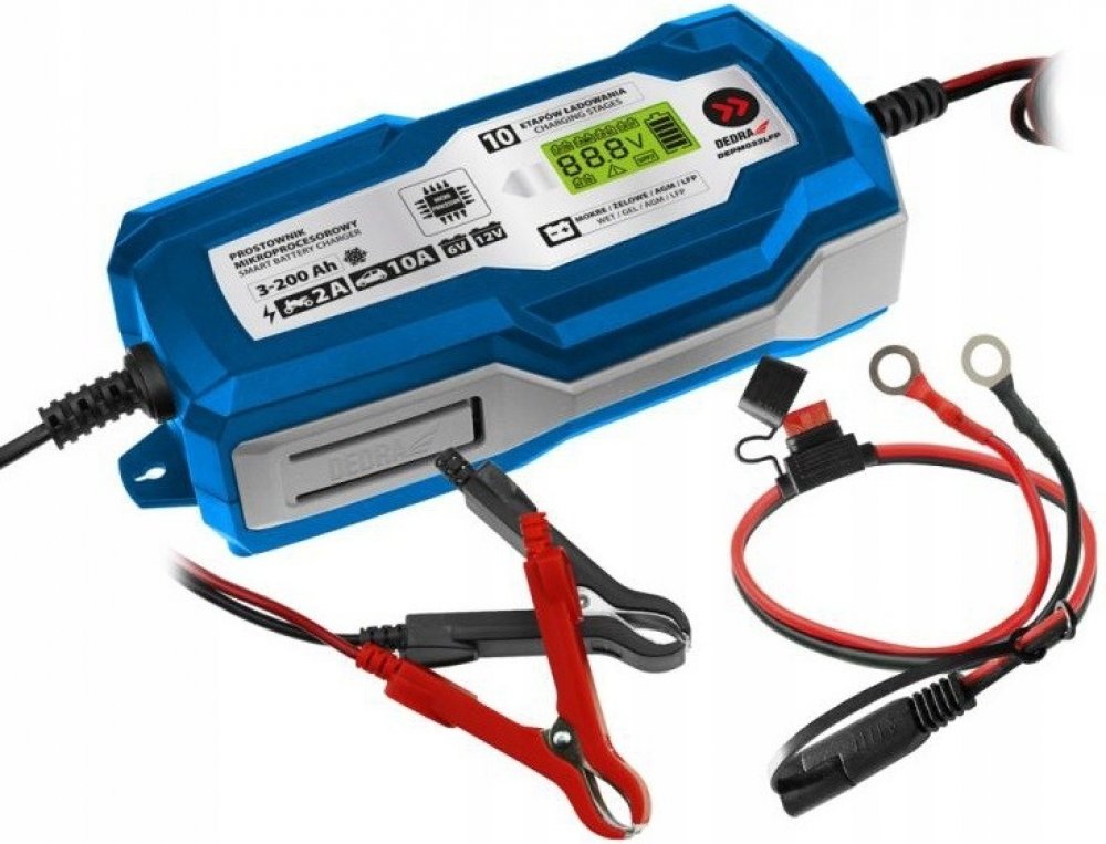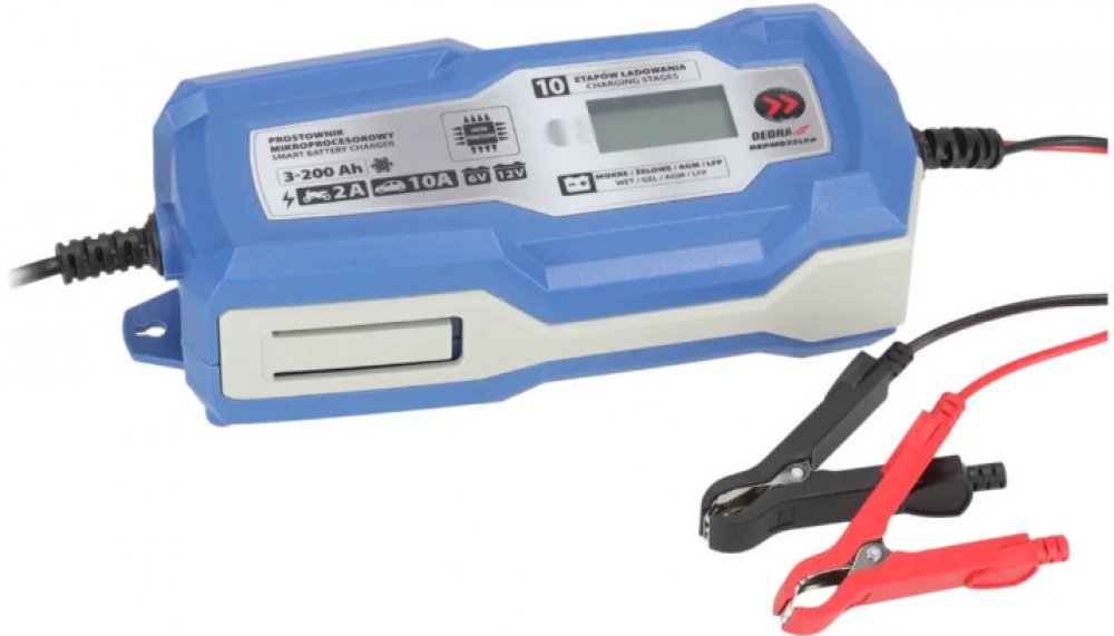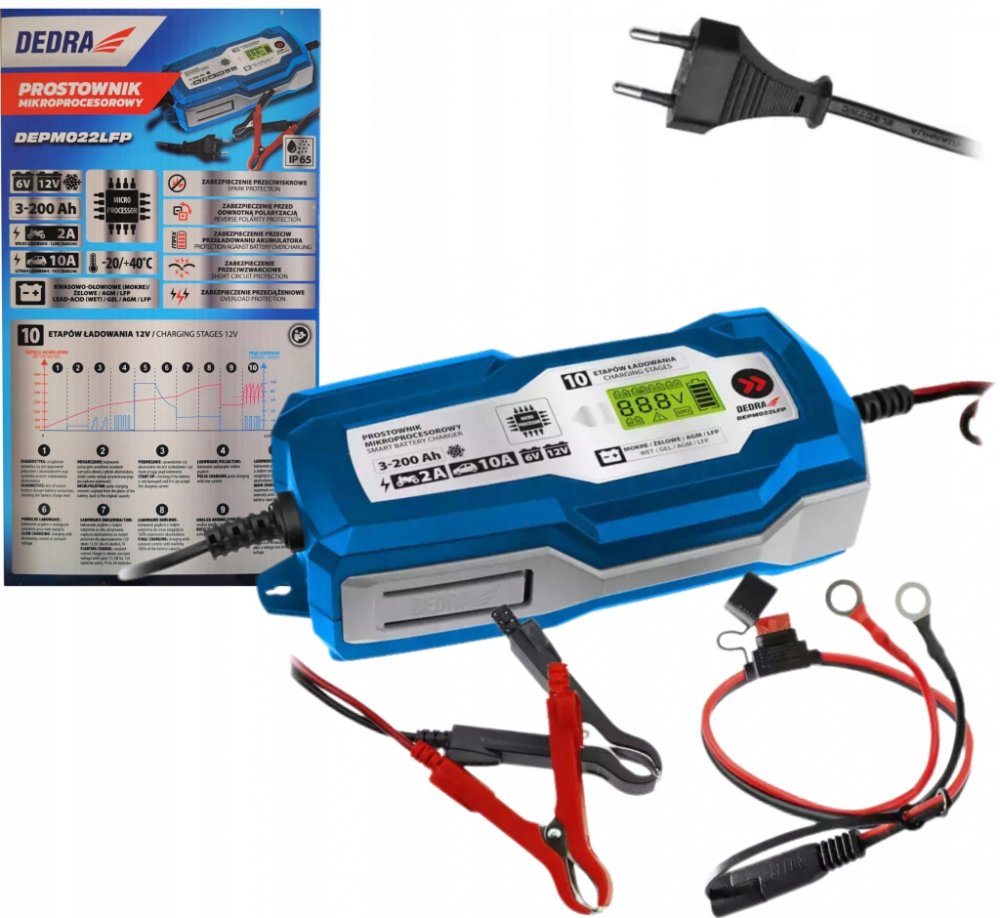 Nabíječka DEPM022LFP je zařízení určené k nabíjení olověných (mokrých), gelových, AGM, LFP baterií s napětím 6/12V a kapacitou 3–200 Ah, které se používají v motocykly, osobní automobily atd. Zařízení je určeno pro použití v domácnostech, opravnách, amatérských pracích. Zařízení má kompaktní pouzdro. Díky mikroprocesoru usměrňovač provede cykly nabíjení baterie přizpůsobením fází provozu stavu baterie.