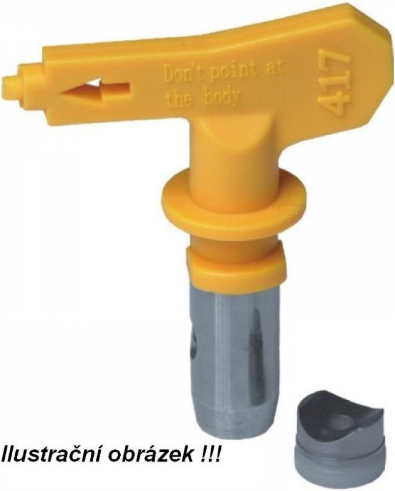 Tryska je klíčovým prvkem, který by měl být správně vybrán v závislosti na typu barvy (tloušťce barvy) a povrchu, který má být barvou pokryt. První číslice kódu trysky označuje úhel proudu barvy, např. Tryska 411-úhel 40 °. Zbývající dvě číslice v 411 představují průměr otvoru trysky v tisícinách palce.