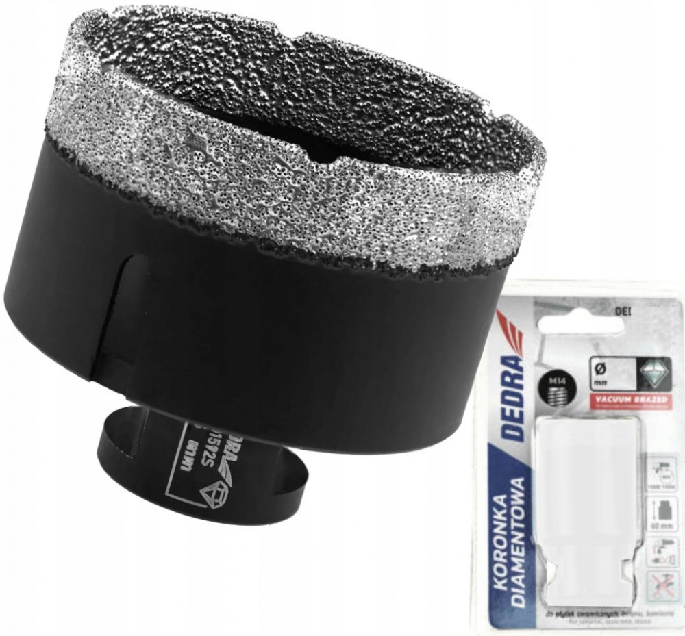 Vakuově pájená - VACUUM BRAZED - DEDRA Diamantová korunka 68 mm / M14 na úhlovou brusku se zvýšenou odolností pro vrtání do pevných materiálů. Korunka je pájena vakuově, nikoliv laserem, díky čemuž je spojení diamantové s tělem vrtáku trvanlivější.
