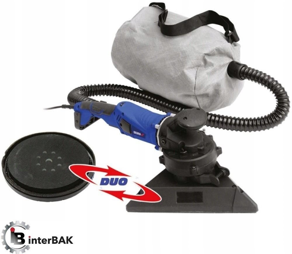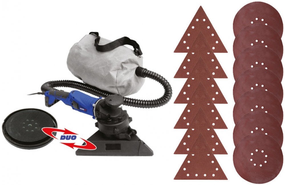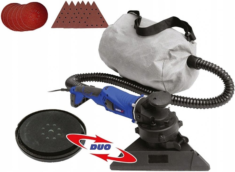 Bruska na sádrokarton, Dedra DED7763. Duo systém - dvě vyměnitelné hlavy. Bruska na sádrové povrchy je zařízení určené k broušení povrchů ze sádrokartonových desek pokrytých sádrovou vrstvou. V konstrukci brusky se nachází odsávací systém se sáčkem na prach. Bruska je vybavena dvěma hlavicemi, kulatou a trojúhelníkovou. Kulatá rotační hlavice slouží k broušení velkých ploch, trojúhelníková oscilač...