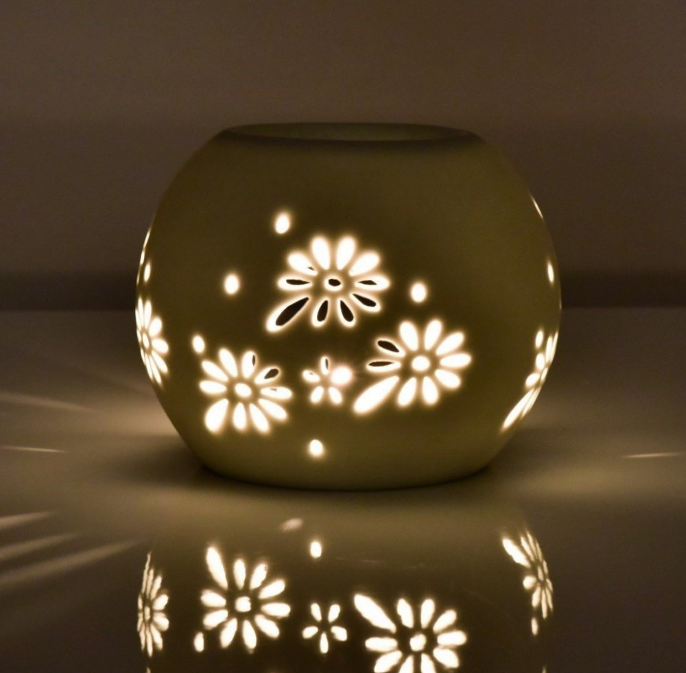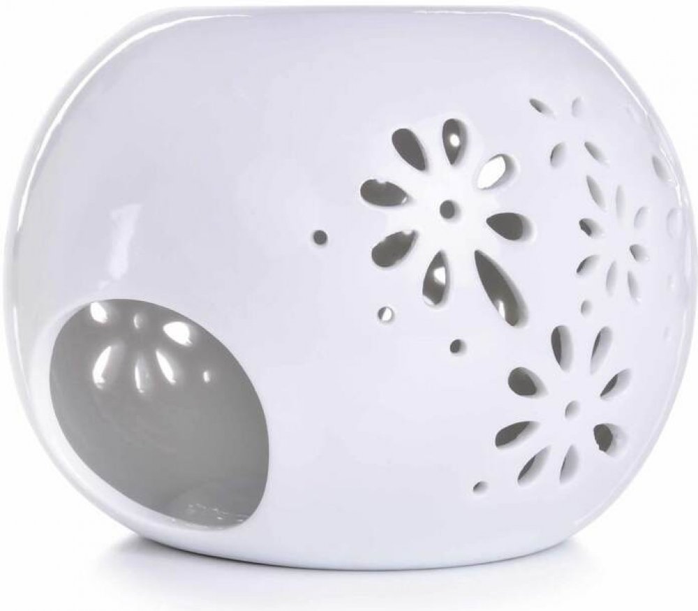 Keramická aromalampa na čajové svíčky s krajkovým dekorem. S lesklou glazurou v bílé barvě. Vytváří krásné světelné efekty. Jednoduchý a přesto elegantní styl se hodí do každého interiéru.