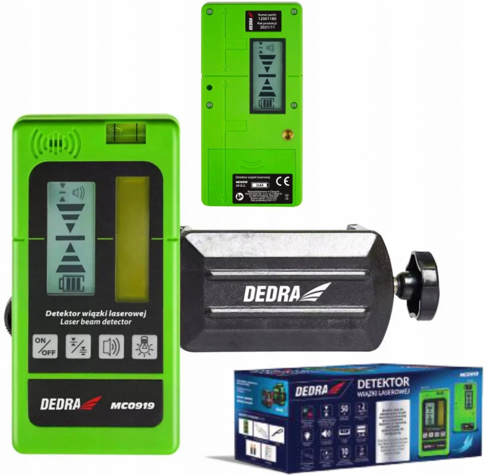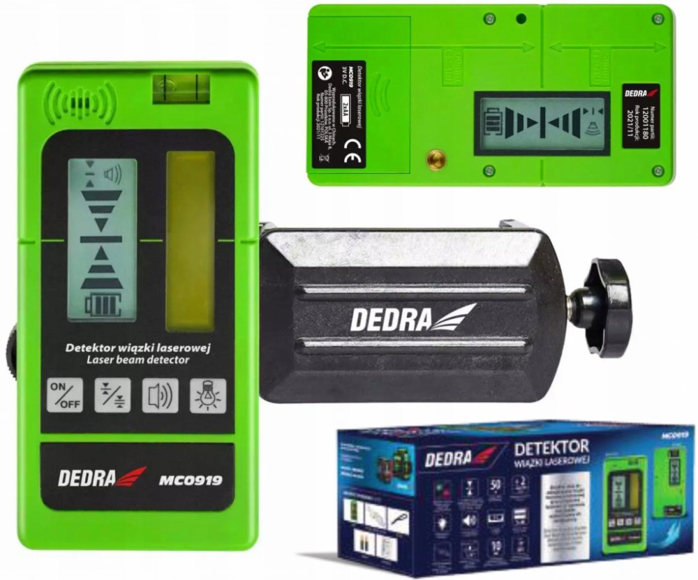 Jedním z nástrojů, který by neměl chybět při renovacích a dokončování interiérů, je detektor laserového paprsku Toto zařízení detekuje dopadající paprsek pomocí světlo citlivého prvku na přední a zadní straně těla. Detektor je tak účinný, že detekuje laserový paprsek, který je často pouhým okem obtížně viditelný. Detektor laserového paprsku má zabudovaný reproduktor se dvěma akustickými tóny, které fungují jako "bzučák", tj. zvukový signál při detekci paprsku. Detektor je kompatibilní s laserovými paprsky v zelené barvě, např. DEDRA MC0903, M C0904, MC0905, MC 0906, a také v červené barvě, např. DEDRA MC0901. Přístroj se snadno ovládá díky snadno čitelnému displeji s podsvícením, držáku pro montáž na lištu a 1/4" závitu pro montáž na stativ. Detektor je napájen dvěma bateriemi AA, tj. oblíbenými prstovými bateriemi (jsou součástí balení), a automatické vypnutí detektoru po 10 minutách nečinnosti zajišťuje dlouhý provoz bez nutnosti jejich výměny. Automatické vypnutí detektoru po 10 minutách nečinnosti zajišťuje dlouhý provoz detektoru bez nutnosti výměny. Vlastnosti křížového laserového detektoru DEDRA MC0919: Detekuje laserové paprsky v zelené a červené 2detektory světla LCD displej, podsvícený Vestavěný reproduktor/zvukový signál-pípne při detekci paprsku Prodloužení účinného dosahu zkříženého laseru Pracovní dosah až 50 m Vestavěná libela pro vyrovnání jednotky Vysoká přesnost nivelace: +/-2 mm/ 10 m Včetně přídavné rukojeti Pulsní funkce Pracovní rozsah: 50 m Typ napájení: 2xAA (3V D C) Stojanový závit: ano, 1/4" Zvukový signál: ano, 2 tóny Provozní teplota: min.-10 °C, max. 50 °C