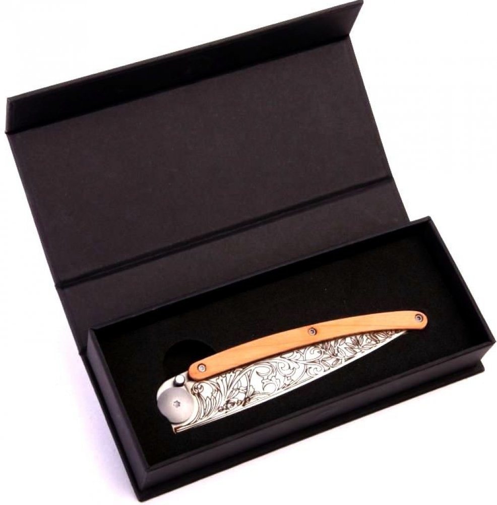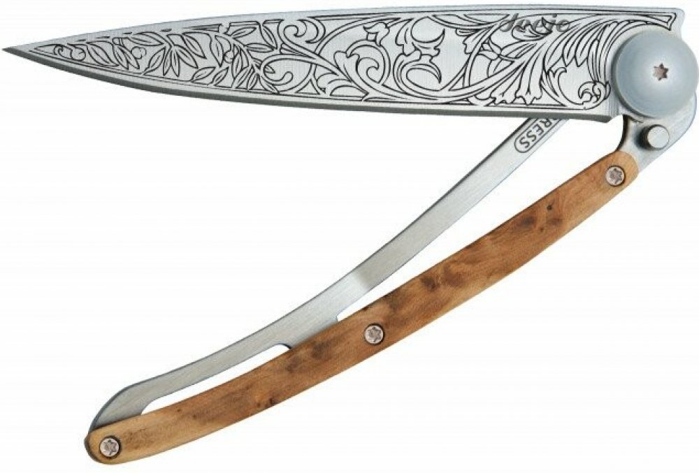 Dřevěná střenka z kořene exotického jalovce vyniká svou trvalou a pronikavou pepřovou vůní. Jalovcové vonné dřevo je odolné, lehké a pevné. Jemná kresba světlého dřeva na jednotlivých nožích variuje, každý nůž je tedy originál.