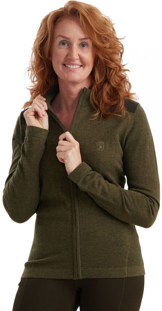 Dámský kardigan Lady Darlington představuje moderní pojetí klasického stylu a elegantně zvýrazňuje ženskou siluetu díky diamantově tvarovaným, čtvrtinově žebrovaným bočním panelům. Měkký úplet z merino vlny poskytuje příjemné teplo a vysoký komfort, díky čemuž je ideální jak pro běžné nošení s džínami, tak jako hřejivá vrstva při outdoorových aktivitách, procházkách nebo lovu. Kardigan je doplněn o vysoký žebrovaný límec a stylové semišové nášivky na ramenou, které mu dodávají moderní a sofistikovaný vzhled. Precizní žebrování v dolní boční části zajišťuje výborné padnutí, jemnost úpletu odpovídá jemnosti Gauge 12 a praktickou výhodou je možnost praní v pračce. Materiálová kombinace merino vlny, akrylu a polyamidu zaručuje tepelný komfort, tvarovou stálost a dlouhou životnost.