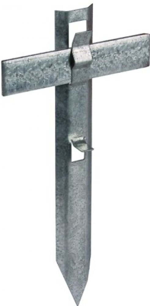 Distanční držák pro uložení uzemňovacího vedení ve výkopech základů, s pojistným jazýčkem proti vypadnutí vodiče. Rovné provedení.