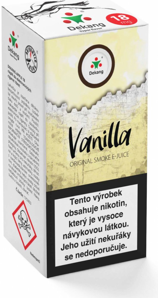 Náplň pro elektronické cigarety (neboli e-liquid, e-juice) DEKANG skvělé autentické chuti. Prvotřídní kvalita je dána použitím nejkvalitnějších ingrediencí a výrobou za velmi přísných hygienických podmínek. Výrobce Changning Dekang Biotechnology Co., Ltd. je ověřeným a největším výrobcem e-liquidů na světě a jeho produkty splňují všechny potřebné standardy a světové certifikace.