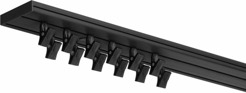 dvouřadá PVC černé kolejnice zvolené délky (kolejnice do délky 200 cm dodáváme celé, od 200 cm a výše ve dvou stejně dlouhých dílech, sadu pak doplníme o spojky)