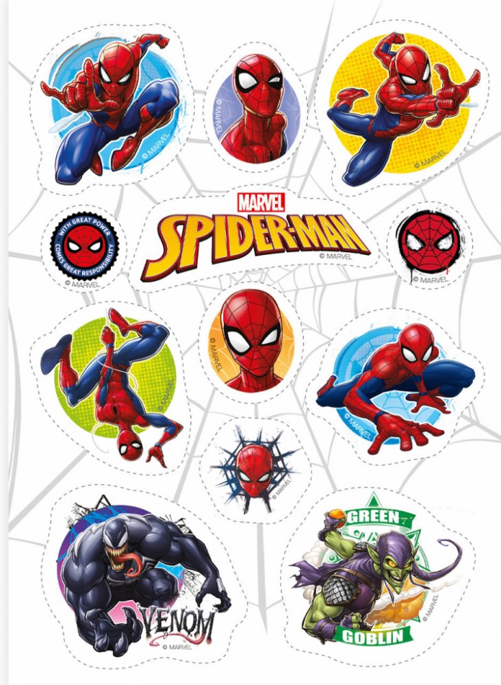 Dekorujte mini zákusky, cupcakes a další dezerty za pomoci jedlých obrázků Spidermana. Obrázky jsou vyrobeny z jedlého oplatkového papíru a výborně se hodí na dorty s Marvel tématikou. Produkt neobsahuje lepek, laktózu, přidaný cukr a je vhodný pro vegetariány.