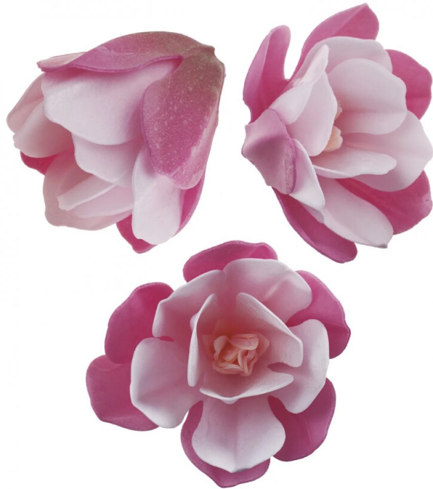 Jedlá dekorace na dort, magnólie 6 ks Dekora přidá dortům a cupcakeům elegantní květinový akcent během pár vteřin. Lehoučké růžové magnólie z jedlého papíru drží tvar, nezatěžují korpus a snadno se aplikují na fondán, krémy i zrcadlové polevy.