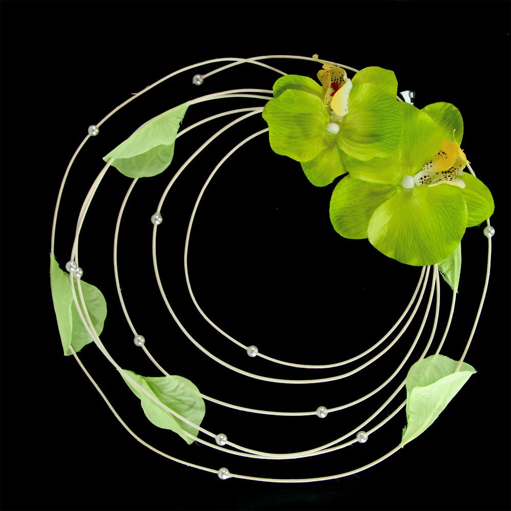 Na pedig je připevněna orchidej v zelené barvě. Stočený pedig zdobí okvětní plátky a perličky v zelených odstínech