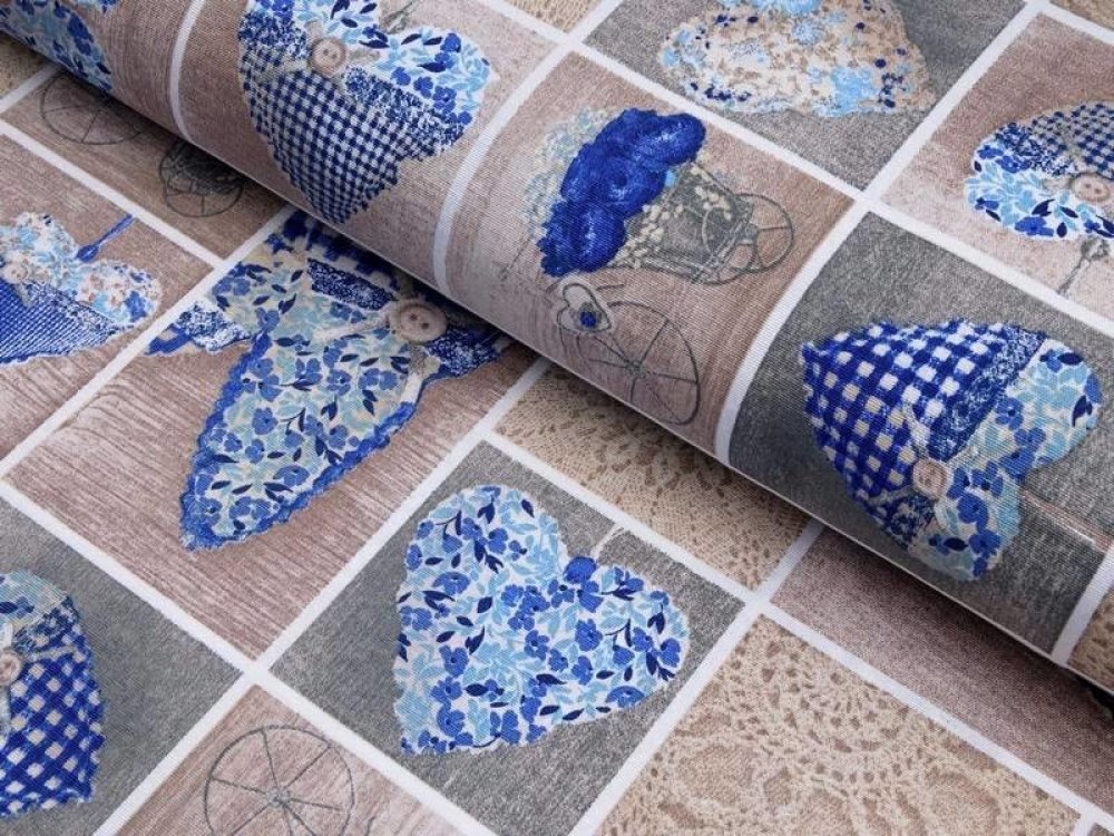 Nabízíme ji v šíři 140 cm a je k dispozici v krásném vzoru modrá srdce a podkladové hnědé barvě.