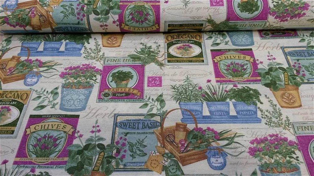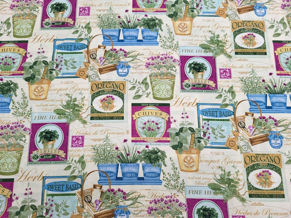 Dekorační látka BOTANIC s motivem bylinek ve stylu Provence.materiál 45% polyester, 55% bavlna