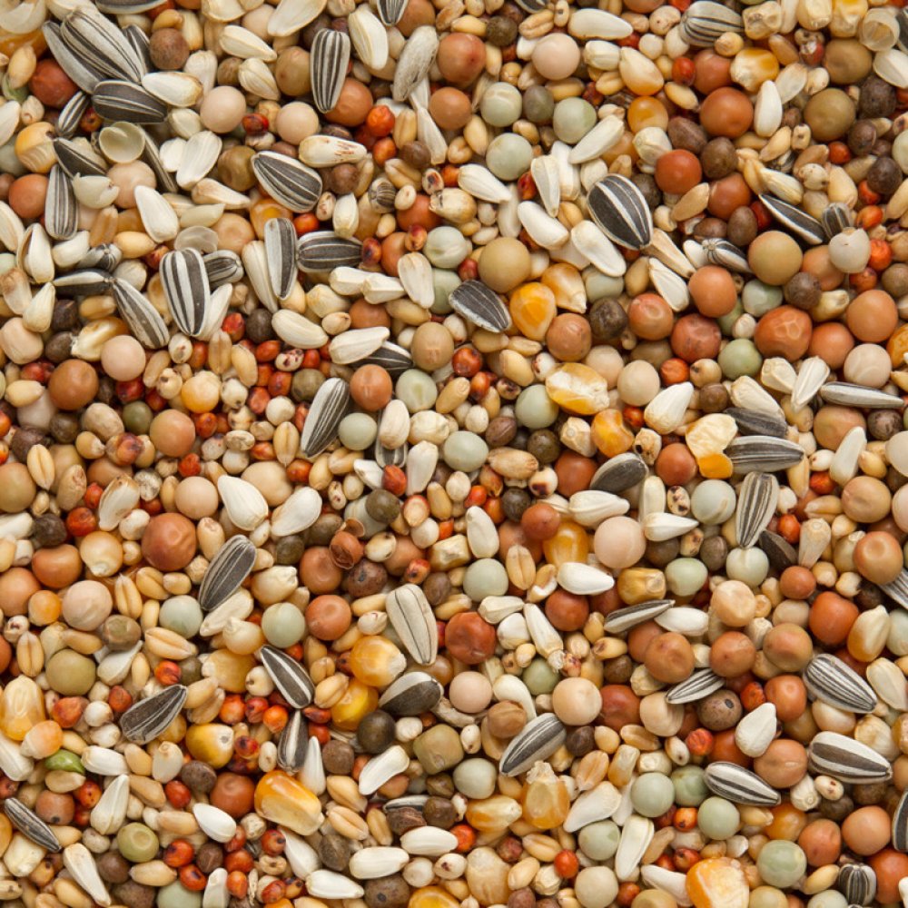 Surovinové složení: čirok 12%, kardi 5%, malý zelený hrách 6%, řepka olejná 1%, vikev 8%, žíhaná slunečnice 2%, bílá pšenice 20%, hrách 14%, mungo červené 12%, pražená kukuřice 8%, malý žlutý hrách 6%, zimní hrách 2%, lněné semeno 2%, kukuřice Merano 2%.