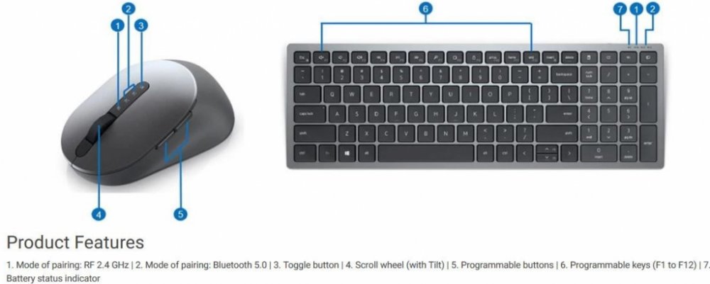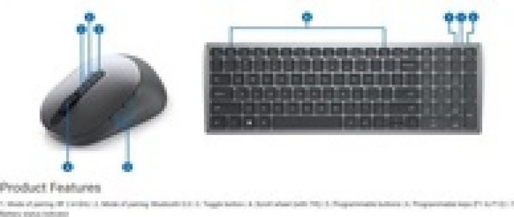 Klávesnice Dell spolupracuje s celou řadou operačních systémů, jako Windows i Android, disponuje klávesovými zkratkami a samozřejmě numerickou částí pro snadné zadávání číselných hodnot. Pro pohodlné psaní lze klávesnici naklonit do potřebného úhlu. Bezdrátová myš Dell je vybavena optickým snímačem s rozlišením 1600 dpi, díky čemuž je zajištěno snadné a plynulé ovládání na širokém spektru povrchů. Podpora softwaru Dell vám umožní efektivně spravovat nastavení klávesnice a myši.