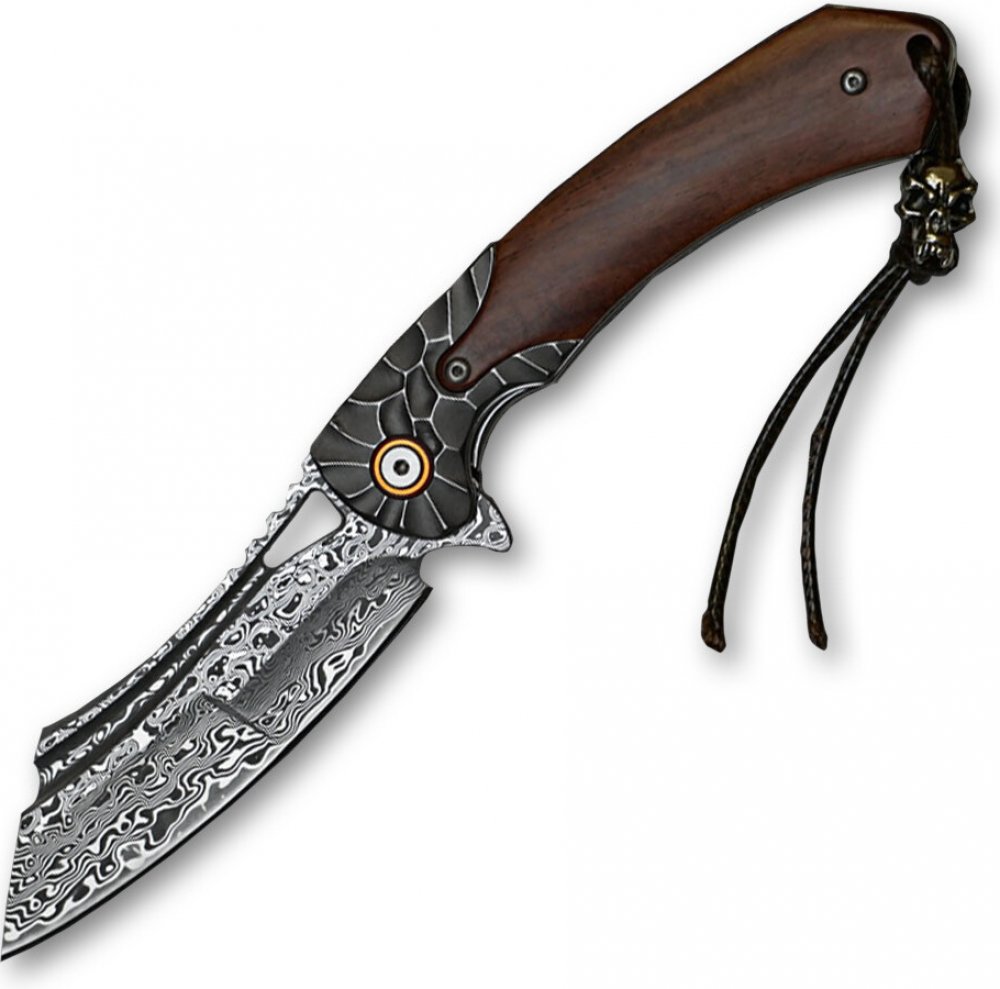 Damaškový zavírací nůž Dellinger Rock VG-10Zavírací nůž Dellinger Rock s čepelí typu tanto disponuje řezným jádrem z damaškové oceli VG-10, které je chráněno 66 vrstvami nerezového damašku. Tato konstrukce zajišťuje tvrdost kolem 61 HRC a špičkovou dlouhotrvající ostrost. Estetika damaškové oceli s jejím nezaměnitelným vzorem působí velmi impozantně. Nůž patří do oblíbené kategorie EDC, takže je ideálním společníkem pro každodenní nošení. Mechanika čepele je uložena na kuličkových ložiscích, díky kterým je otevírání bleskové a plynulé. Bezpečnost zajišťuje osvědčená pojistka liner lock. Rukojeť z exotického palisandru sisso wood doplňuje masivní kování v unikátním dekoru obsidián. Palisandr vyniká svou hloubkou barev, tvrdostí a tvarovou stabilitou. Elegantním detailem je oranžový kroužek z titanu a paracord zakončený dekorativní lebkou. Součástí balení je pouzdro z poctivé kůže.Kvalita bez kompromisůParametry nástrojeCelková délka:210 mmDélka čepele:90 mmSíla čepele:4,0 mmHmotnost:180 g