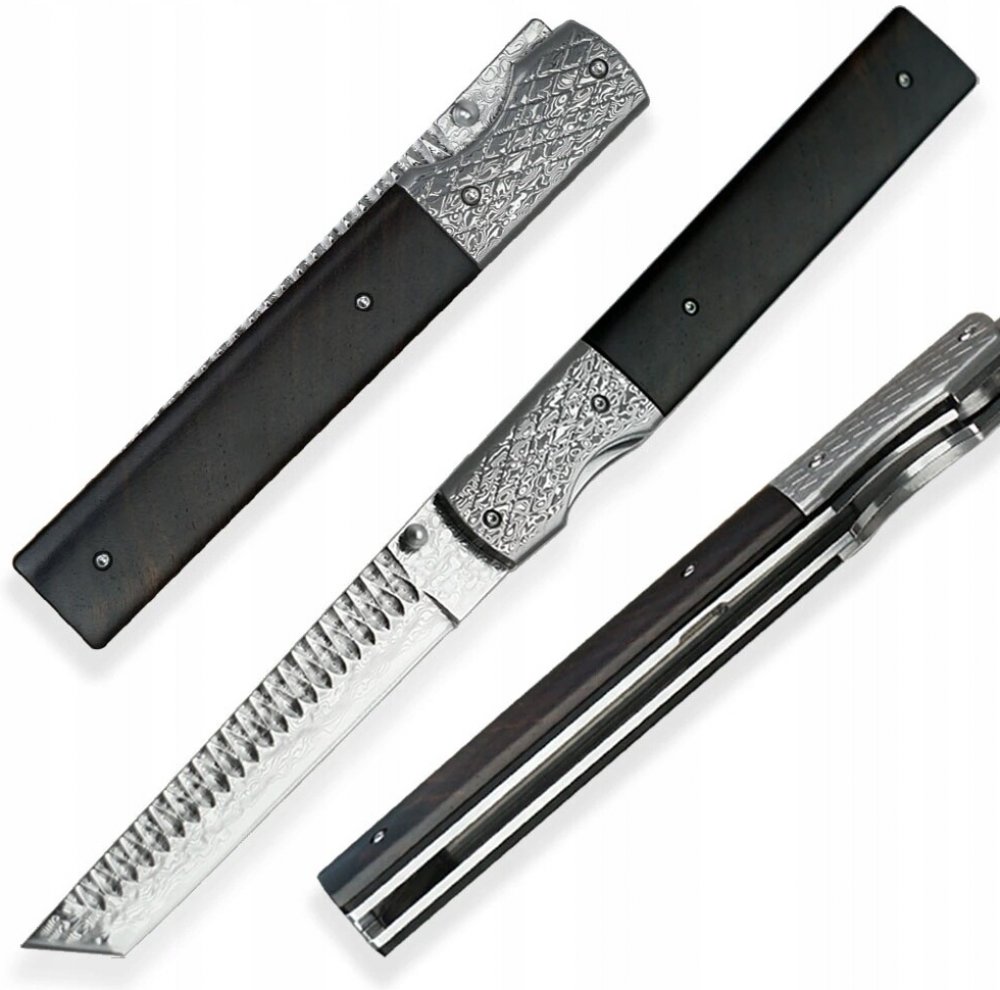 Damaškový nůž Dellinger Tanto Lenge II Obsidian s ebenovou rukojetíNůž Dellinger Tanto Lenge II představuje vrcholný model v kategorii prémiových zavíracích nástrojů. Čisté linie a přímý design odkazují na tradiční japonskou estetiku. Tento outdoorový společník s robustní konstrukcí disponuje špičkovým řezným jádrem z japonské oceli VG-10 o tvrdosti 61 HRC, které je chráněno 66 vrstvami nerezových damaškových ocelí. Vyšší hmotnost nože napomáhá stabilitě při precizní práci a náročnějších úkolech. Jak primární hlavní ostří, tak sekundární ostří na hrotu tanto čepele, jsou ručně dobrušované. Průsečík těchto dvou linií (známý jako Yokote) vytváří velmi efektivní hrot s mimořádnou odolností. Ergonomická rukojeť z ebenového dřeva má štíhlý profil, skvěle sedí v dlani a zabraňuje protáčení nástroje při manipulaci.Kvalita bez kompromisů pro sběratele i dobrodruhyParametry nástrojeCelková délka:295 mmDélka čepele:135 mmSíla čepele:3,0 mmHmotnost:264 g