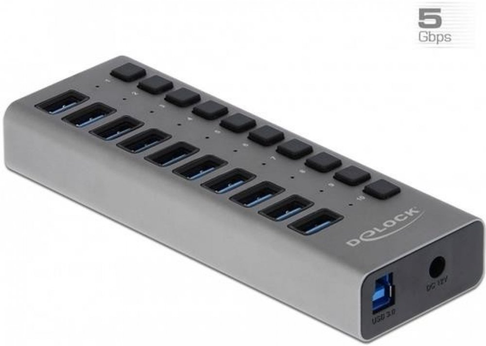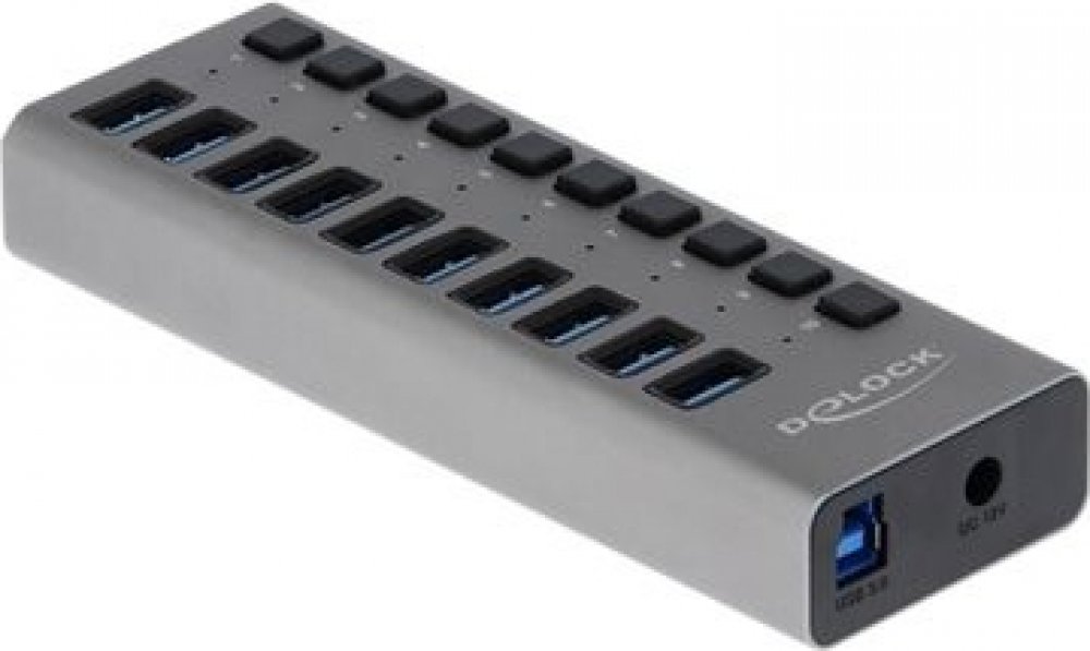 Tento stabilní USB hub Delock v kovovém krytu, je připojen k počítači přes USB port typu A. Rozšíří počítač o 10 USB konektory typu A. Umožňuje nabíjet připojená zařízení, jako např. smartphony nebo p