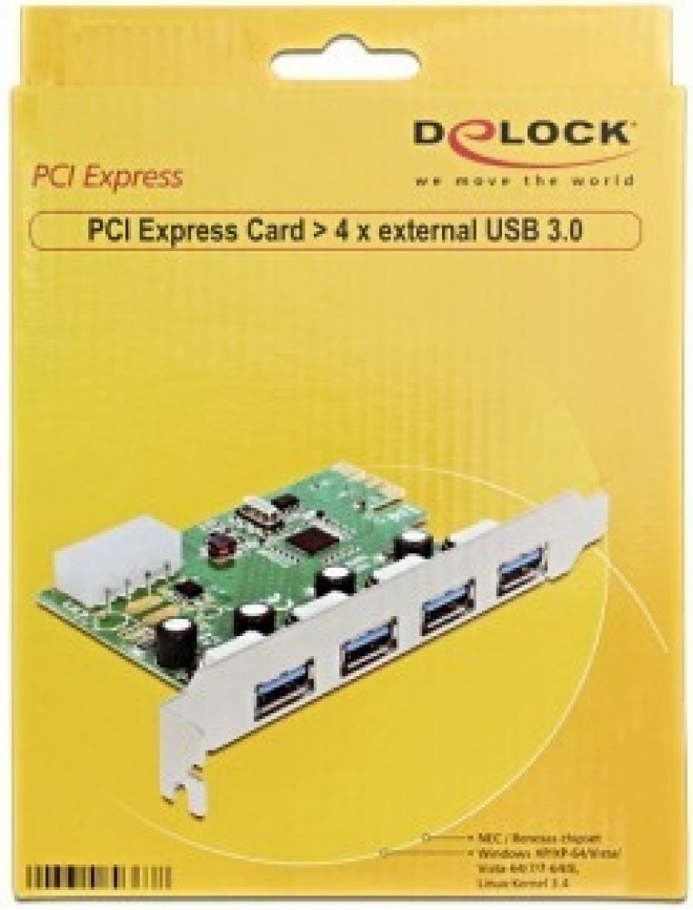 Delock PCI Express karta přidává do vašeho počítače čtyři externí USB 3.0 porty. Umožňuje připojení zařízení s USB rozhraním - např. tiskárny, skenery, MP3 přehrávače, čtečky paměťových karet a podobně.Specifikace• Chipsetem: NEC / Renesas• Konektor:externí:4 x USB 3.0 typ A samiceinterní:1 x Molex 4 pin napájecí konektor1 x PCI Express x1, V2.0• Rychlost přenosu dat až:SuperSpeed 5 Gb/s,