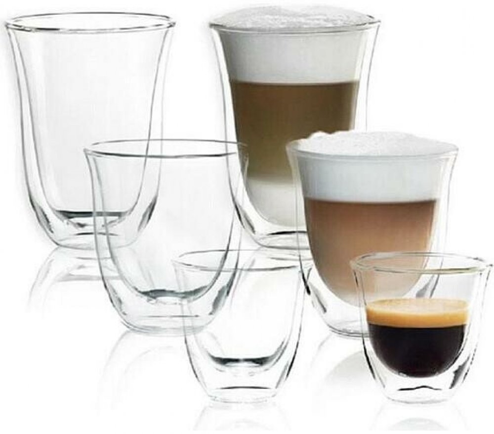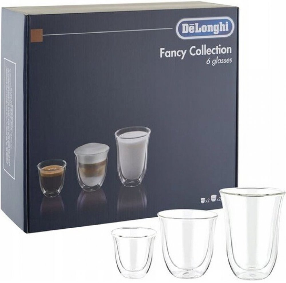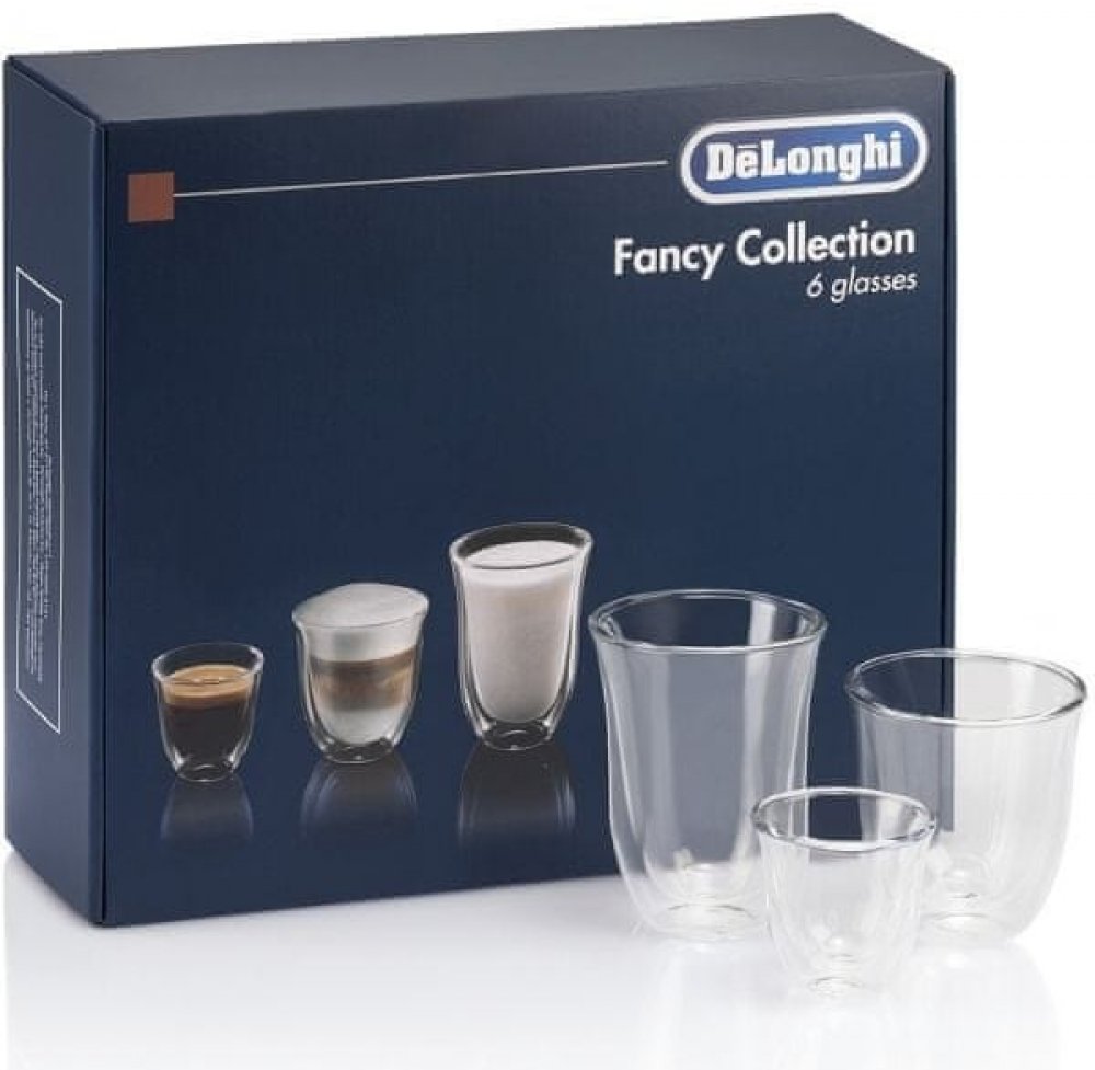 Pořiďte si praktický set tří párů skleniček pro různé druhy kávy od značky De'Longhi.Pořiďte si praktický set několika druhů skleniček od značky De'Longhi do vaší domácnosti a vychutnejte si kávu v kvalitních skleničkách. Set obsahuje dvě skleničky na espresso o objemu 60 ml, dvě skleničky na cappuccino o objemu 190 ml a dvě skleničky na latte macchiato o objemu 220 ml. Všechny skleničky mají dvojitou stěnu a jsou vyrobeny z borosilikátového skla. Jsou vhodné pro mytí v myčce.Proč si zvolit tuto sadu skleniček? sada tří párů skleniček pro různé druhy kávykvalitní provedení od značky De'Longhi mají dvojitou stěnu vhodné do myčky