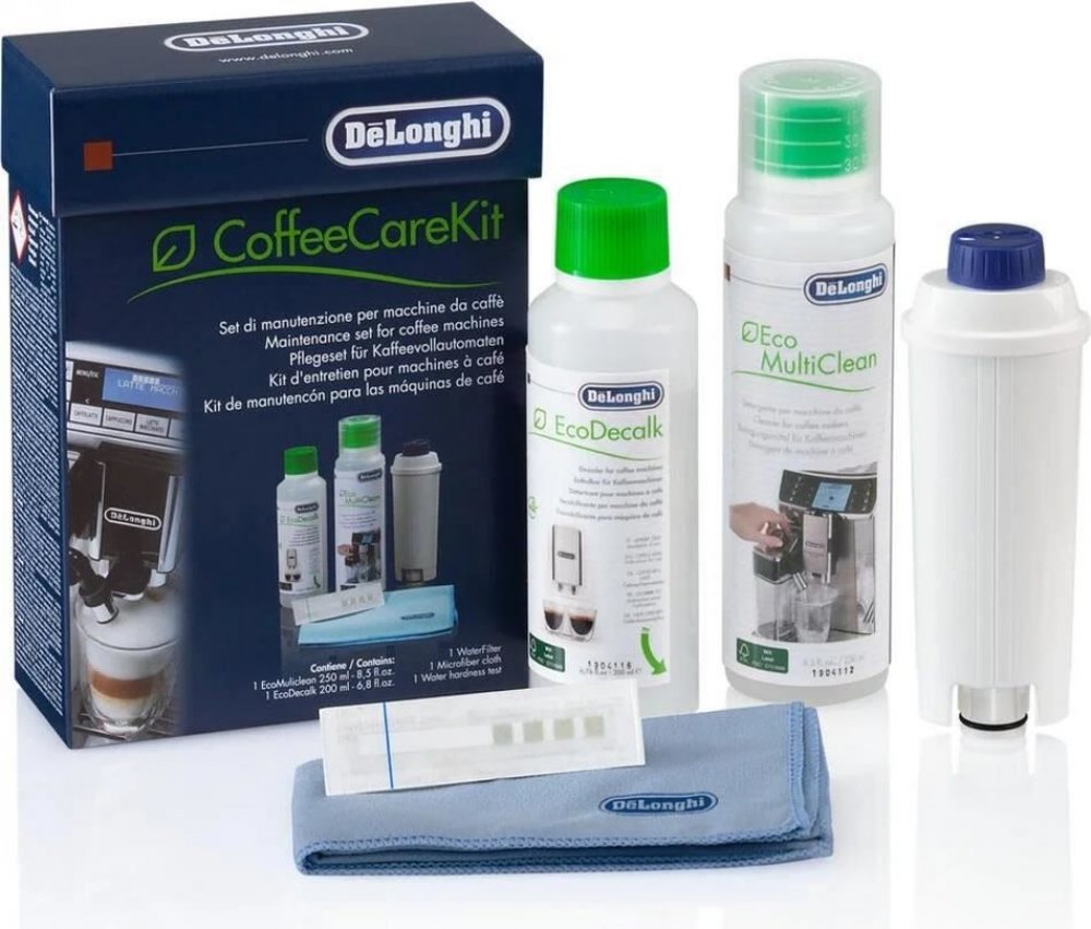 De'Longhi DLSC306Sada De'Longhi DLSC306 je nezbytná pro udržování kávovaru v perfektním stavu a pro stále stejnou chuť a vůni kávy. Sada od značky De'Longhi je ideální pro čištění espress a kávovarů. Součástí sady DLSC306 je 200 ml přípravku EcoDecalk, který vydrží na 2 odvápnění, čistič Eco MultiClean 250 ml, s ověření tvrdosti vody vám pomůže testovací proužek, případně vám s tvrdostí vody pomůže filtr, který je také součástí. Pro praktické využití je v sadě připojena i utěrka z mikrovlákna. Co je v krabiciEcoDecalkEco MultiCleanTestovací proužekFiltrUtěrka z mikrovlákna.