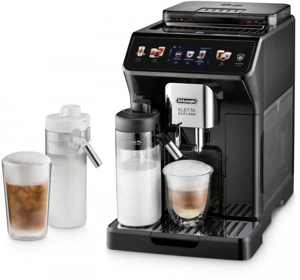Automatické espresso DeLonghi Eletta Explore ECAM 450.65.G vám připraví oblíbený šálek kávy rychle a snadno. Kávovar zvládá více než 50 horkých i studených nápojů, jistě si každý najde svého favorita. Kávovar má tlak 19 bar a výkon 1 450 W. Mléčné nápoje připraví jediným stiskem. Na přední straně se nachází dotykový 3,5" TFT displej s intuitivním ovládáním a 4 dotykovými ikonami. Přístroj je vybaven tryskou na horkou vodu, 2 karafami na studenou a horkou mléčnou pěnu a zásobníkem na vodu s objemem 1,8 l. Teplota vody má 3 stupně regulace. Funkce Káva s sebou a příprava 2 šálků najednou šetří váš čas.