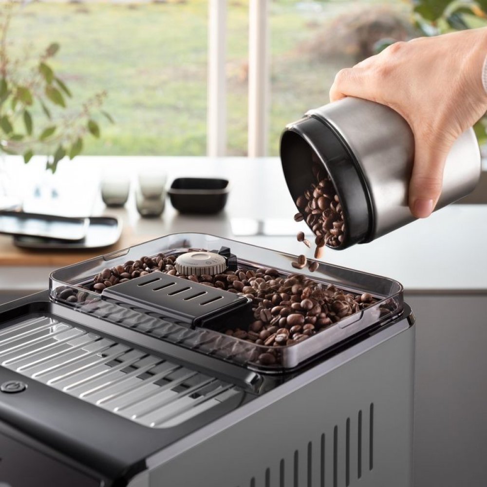 DeLonghi titanová dotykové s integrovanou nádobou na mléko 19 bar 1.8 l 300 g 135 mm 1 barevný TFT displej pro latté sklenice a termohrnky s nádržkou na vodu 1450 W ocelové 13 11.4 kg 38.5 cm 26 cm 45 cm 4 pro 3-4 osoby standardní 50 testováno na rostlinné mléko