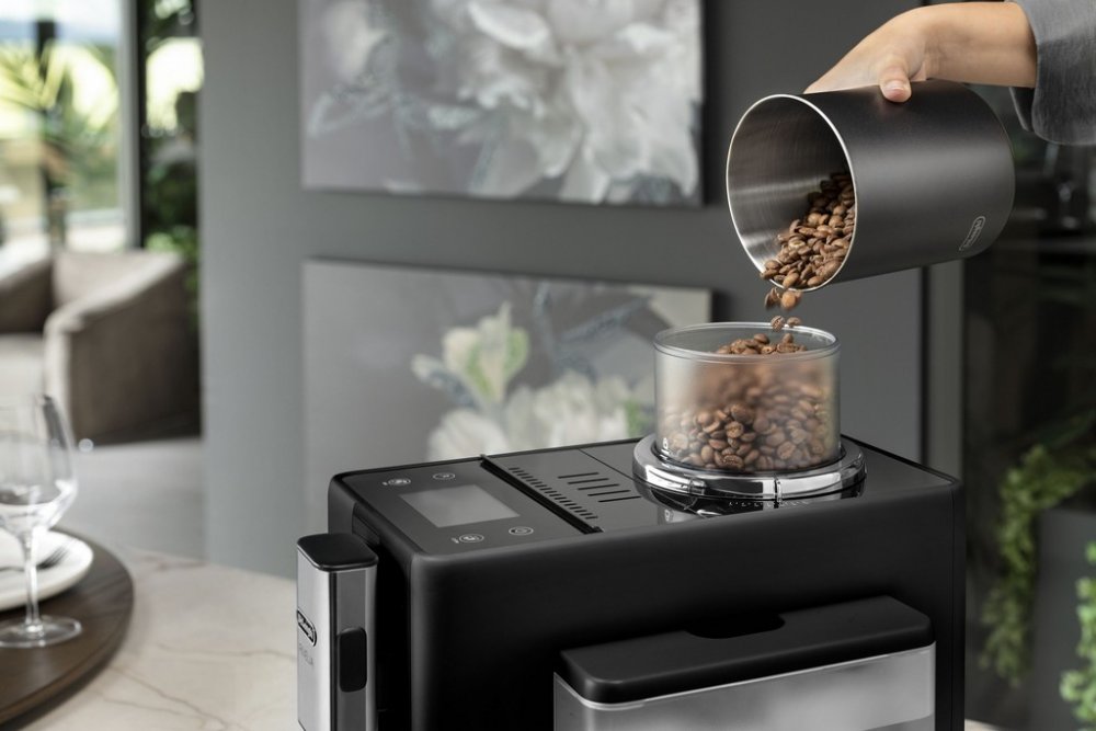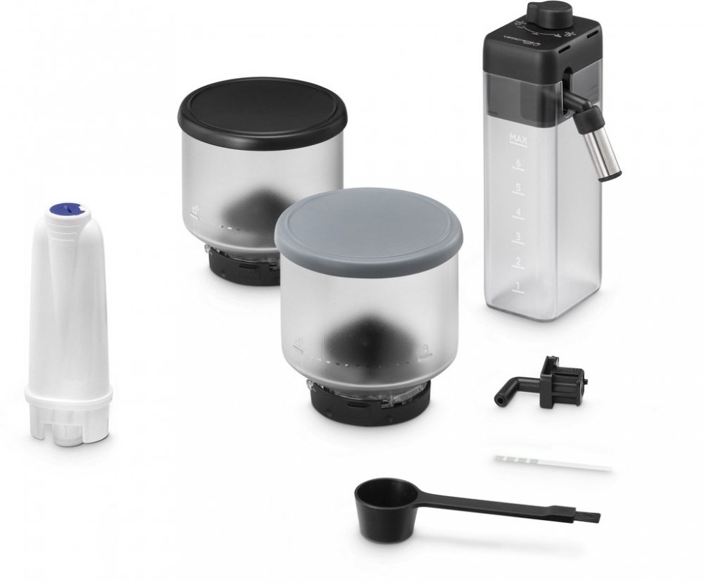 Kávovar má vlastní mlýnek na kávová zrna a jedno nápadité překvapení - vyměnitelné zásobníky na kávová zrna. Pokud tedy zatoužíte ochutnat nový druh kávy, nemusíte čekat až dopotřebujete stávající, ale jednoduše vyměníte stávající zásobník za druhý s novými zrnky. V samotném mlýnku přitom vždy pár zrnek zůstane, ale je to taková dávka, která vystačí přesně na jednu kávu, nebo zrnka můžete vymlít naprázdno.