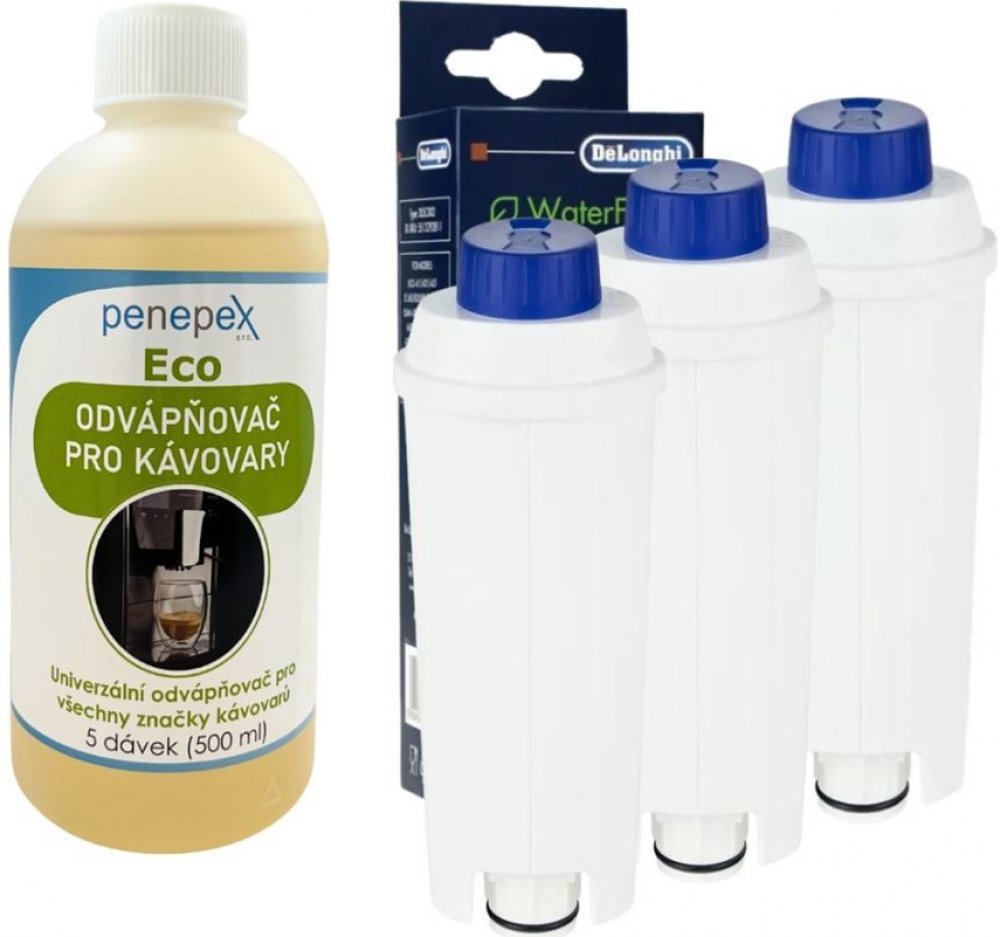 DeLonghi SER3017 DLSC002 – 3× vodní filtr + Penepex Eco odvápňovač 500 mlHledáte spolehlivé a jednoduché řešení pravidelné údržby kávovaru DeLonghi? Tato sada kombinuje tři originální vodní filtry DeLonghi SER3017 DLSC002 a ekologický univerzální odvápňovač Penepex Eco 500 ml. Společně zaručí čistou vodu, stabilní výkon přístroje a plnou chuť každého šálku.3× DeLonghi SER3017 DLSC002 – jistota čisté vody a skvělé chutiOriginální filtry DeLonghi jsou navržené pro maximální kompatibilitu a účinnost. Filtrační směs aktivního uhlí a iontoměničové pryskyřice snižuje obsah chlóru, pachové stopy i vybrané kovy, zároveň upravuje tvrdost vody a omezuje vznik vodního kamene. Díky tomu chrání vnitřní komponenty přístroje a pomáhá udržet stabilní teplotu i tlak při extrakci. Optimalizovaná filtrace pro přirozené aroma a vyváženou chuť. Méně vodního kamene = delší intervaly mezi odvápněním. Doporučená výměna zhruba po 2 měsících nebo cca 50 litrech vody (dle tvrdosti a intenzity používání). Snadná instalace – výměnu zvládnete během minuty, bez nářadí.Penepex Eco 500 ml – šetrné a účinné odvápněníPenepex Eco je odvápňovač na bázi kyseliny mléčné – účinný na minerální usazeniny, ale šetrný k těsněním, kovovým i plastovým částem kávovaru. Nezanechává nežádoucí pachuť ani zápach, takže po údržbě můžete navázat přípravou kávy bez zbytečného čekání. Ekologické složení bez agresivních přísad. Bezpečný pro domácí použití i menší kanceláře. 500 ml vystačí na několik kompletních odvápňovacích cyklů. Plynulejší chod čerpadla a stabilnější ohřev vody.Proč zvolit tuto sadu Kompletní péče v jednom balení: prevence (filtry) + řešení (odvápnění). Lepší chuť kávy díky čisté vodě bez pachových stop a rušivých příměsí. Ochrana investice – nižší riziko poruch a delší životnost přístroje. Snadná údržba bez složitých postupů a zbytečných nákladů na servis. Jak sadu používat pro nejlepší výsledek Vyměňujte filtr pravidelně (cca každé 2 měsíce nebo po ~50 litrech; dle tvrdosti vody). Řiďte se doporučením přístroje k odvápnění – při signalizaci proveďte cyklus s Penepex Eco. Po odvápnění vždy kávovar dobře propláchněte dle návodu výrobce. Další sady a varianty pro údržbuHledáte jiný počet filtrů nebo specifické kombinace příslušenství? Prohlédněte si další sady pro údržbu kávovaru. Najdete zde řešení pro různě vytížené domácnosti i kanceláře, a také sety pro další značky.Součástí balení je: DeLonghi SER3017 DLSC002 filtr do kávovaru (3 ks) a Penepex Eco univerzální odvápňovač 500 ml.Bezpečnostní zdroje Penepex s.r.o., náměstí Hrdinů 470, 686 03 Staré Město, Česká republikaTel.: +420 728 706 343, E-mail: info@penepex.cz