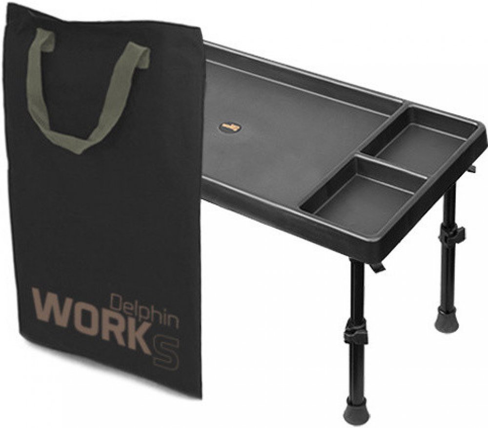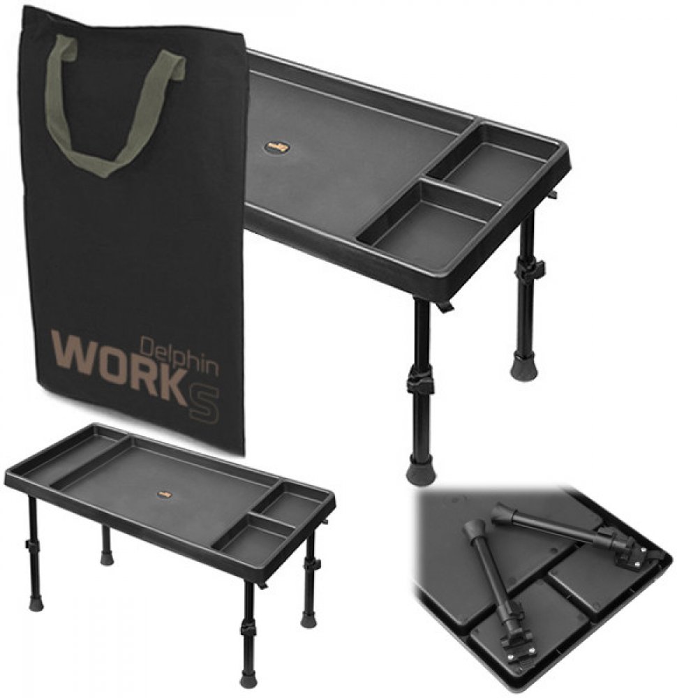 Plastový stolek WORKS je zkrátka užitečným kouskem rybářského vybavení, který budete používat stále. Má teleskopické nohy, které dokážete zvednout o 10cm, takže samotná výška stolku se tak pohybuje od 24 do 34cm (měřený vrchní okraj stolku). Nohy je možné zamknout speciálním blokovacím systémem, čili nehrozí zhroucení stolku a věcí na něm. Konce nohou jsou vybaveny gumovými koncovkami pro lepší stabilitu. WORKS se dodává s přepravní taškou.