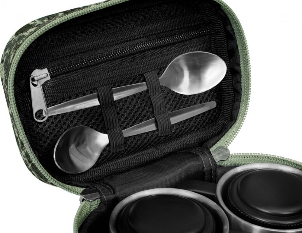 COTEA obsahuje dva kvalitní nerezové hrníčky, dvě čajové lžičky a také dvě uzavíratelné nerezové nádobky, které poslouží například pro cukr a kávu. Samotná taštička disponuje malou síťovanou kapsou, která bez problémů pojme dostatečnou zásobu čajových sáčků. Navíc je opatřena kvalitními zipy, přičemž ten vnější je vybaven praktickým taháčkem s logem firmy Delphin. COTEA je designováno v jedinečné C2G kamufláži s efektním piktogramem definujícím využití tohoto zajímavého produktu.