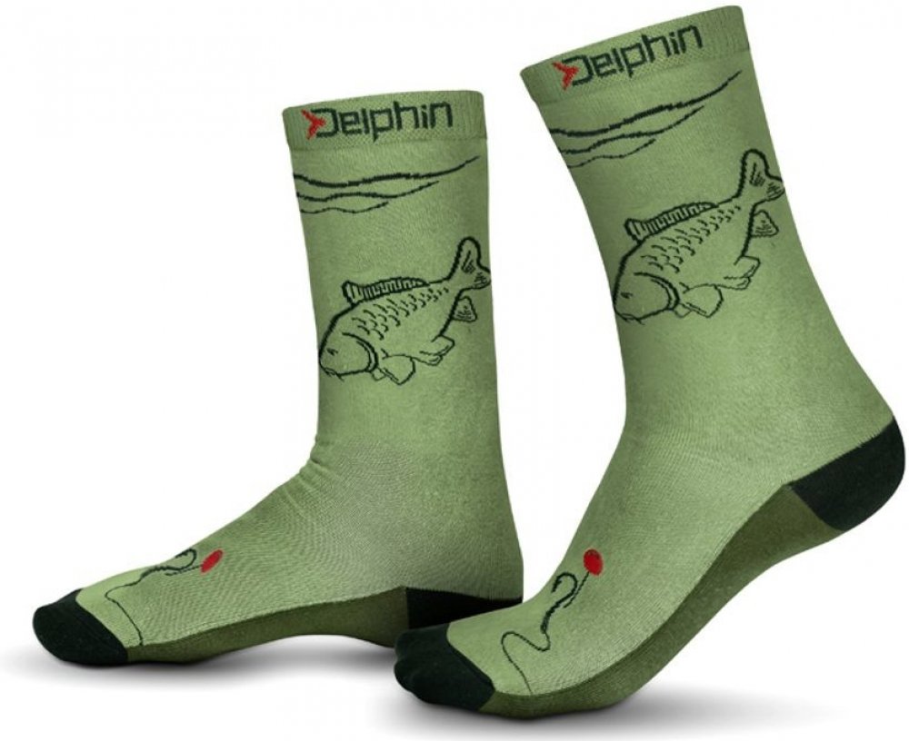 V šatníku správného rybáře nesmí chybět dobré ponožky a to hlavně ty, které na sobě nesou design s kaprem. Kombinace zelené a červené barvy s rybářským motivem si nepochybně najde své příznivce mezi mladší, ale i starší generací rybářů.