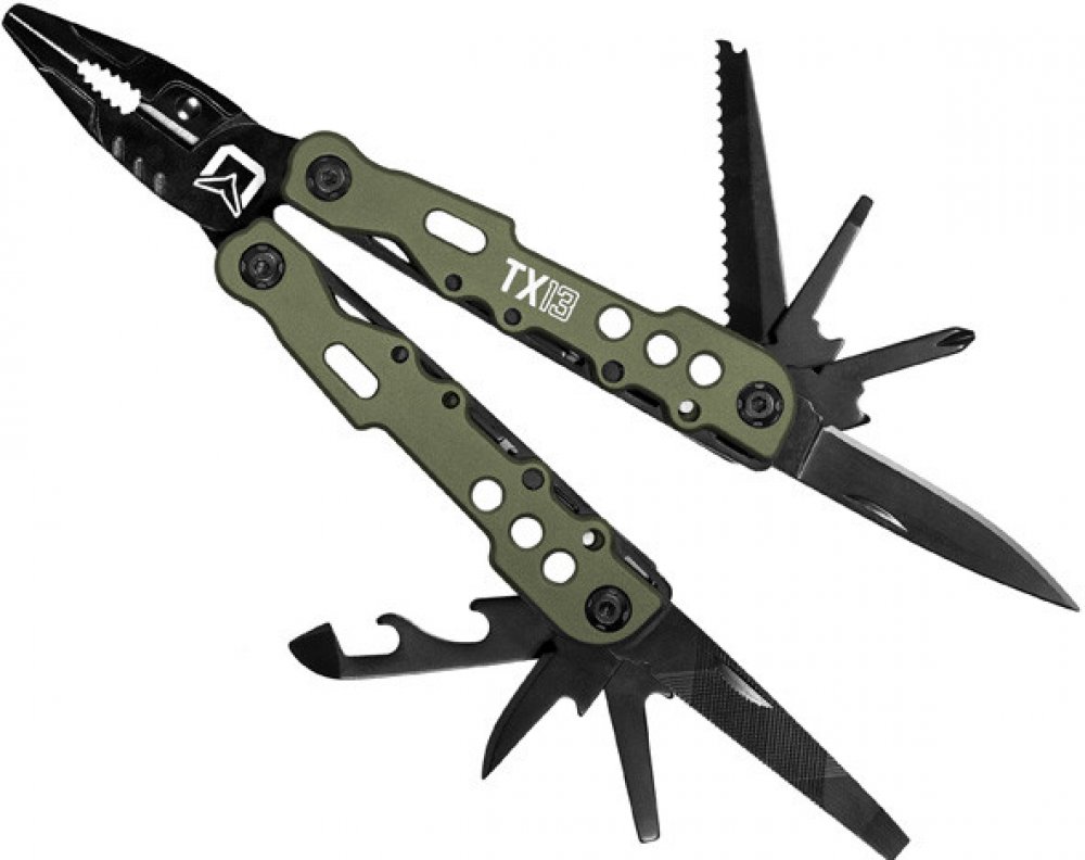 Delphin TaktyX 13 jsou vyrobeny z kvalitní nerezavějící oceli Inox. Tak jak napovídá číslice v názvu, disponují až 13-ti různými nástroji resp. funkcemi. Kromě klasických kombinovaných kleští se zde nachází nůž, pilka, otvírák na konzervy a láhve, pilník, nůžky na drát, děrovačka a 4 různé šroubováky. Každý z těchto nástrojů se po vyklopení automaticky zajistí pomocí spolehlivého systému, díky čemuž nehrozí zaklápění během používání.