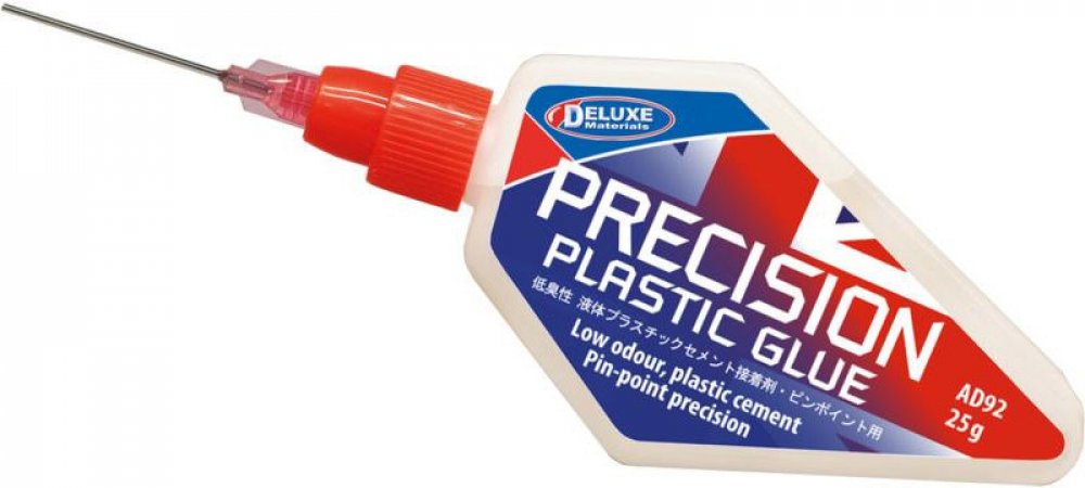Je chemicky navržen tak, aby odolával ucpávání jehly a při používání nezhoustl. Precision Plastic Glue je dodáván v průhledné plastové lahvičce, která se snadno drží, aby byla vidět hladina lepidla, a má odnímatelnou jehlu pro vyšší bezpečnost. Pracovní čas je 10 s, což je optimální pro plastikové modely.