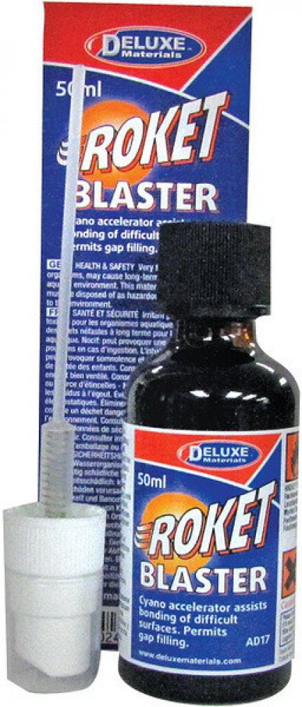 Roket Blaster je katalyzátor, který díky zvýšení pH umožňuje rychlou polymeraci vteřinových lepidel nanesených i v silné vrstvě na nesavých površích. Aktivátor je dodáván v nádobě opatřené rozprašovačem. Díky speciální formuli nenapadá ani čiré akrylátové plasty!